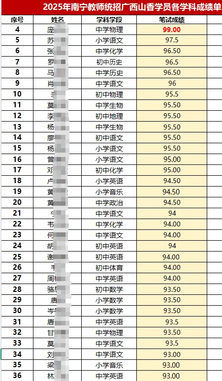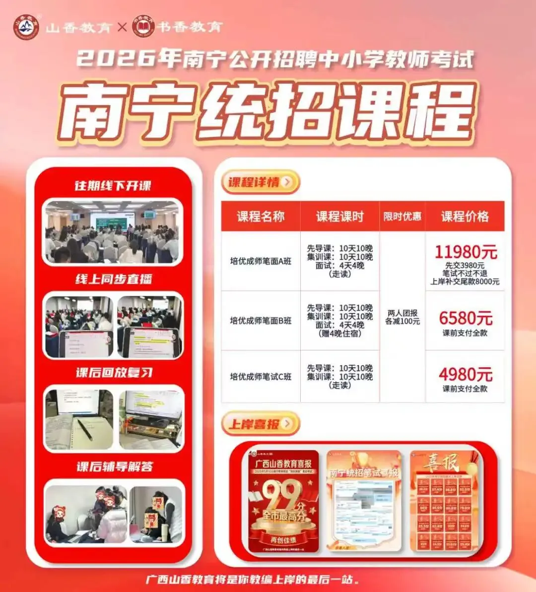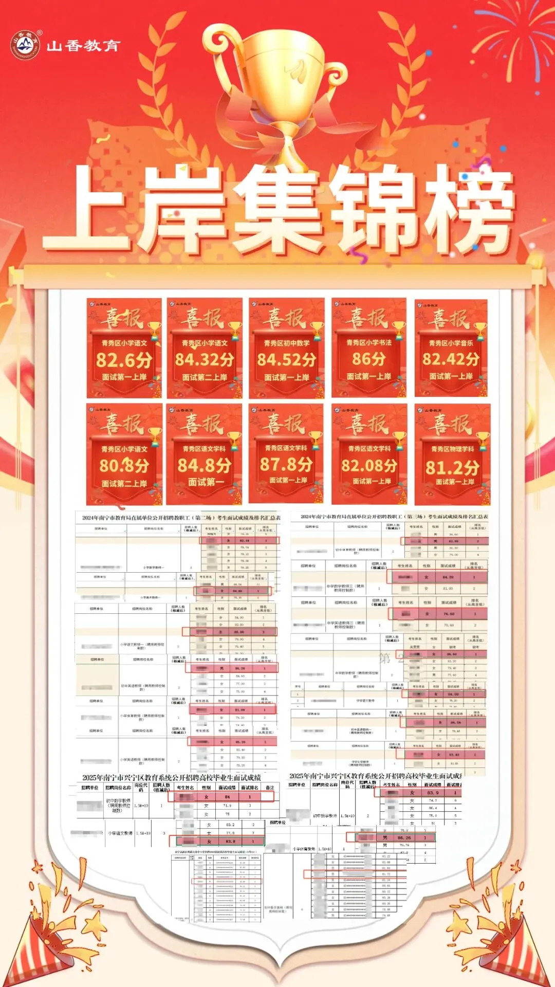 山香深耕南宁教招,始终以专业、负责的态度,陪伴每一位南宁考编人前行!实力见证荣光——2025年上半年南宁教师统招最高分99分,第二名是97.5分。都是出自山香学员!这不是偶然,而是山香专业教研、精准授课、全程护航的必然结果!