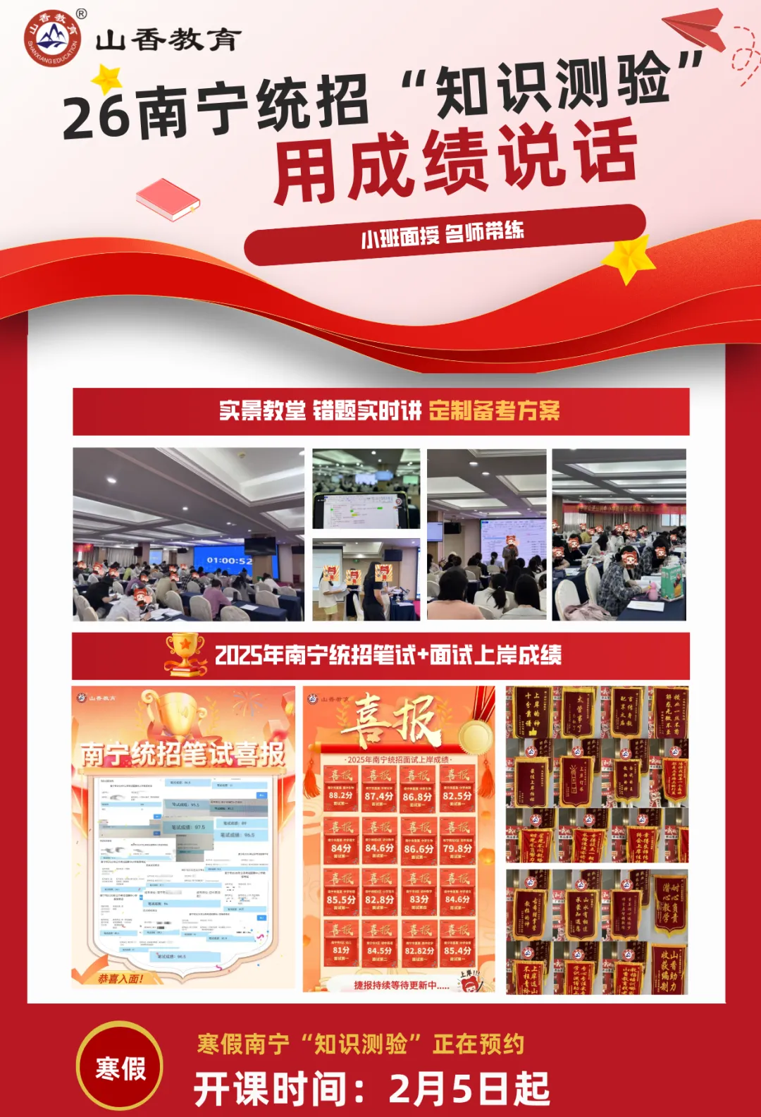 正值备考黄金期,山香南宁“知识测验”集训班重磅来袭,3月21日正式开课,抢占备考先机,就是抢占上岸主动权!