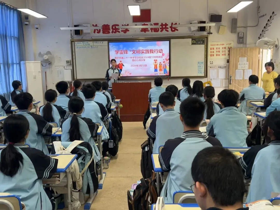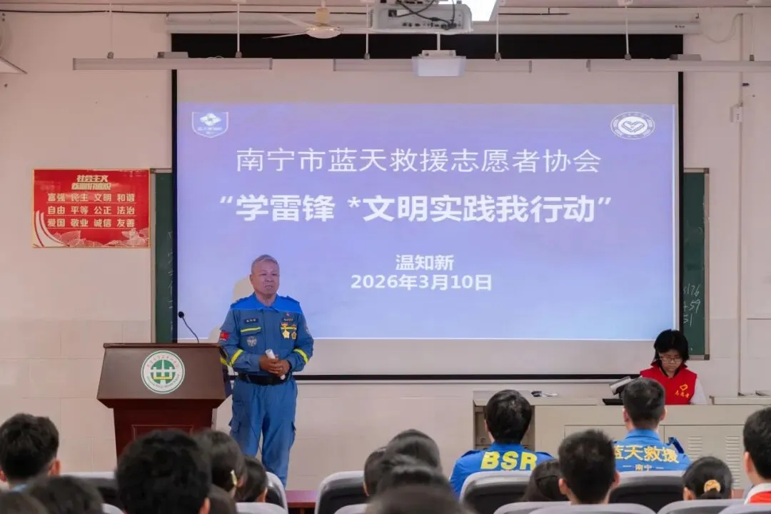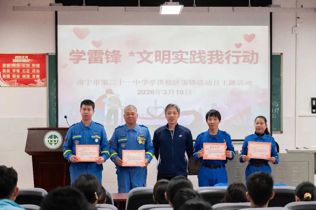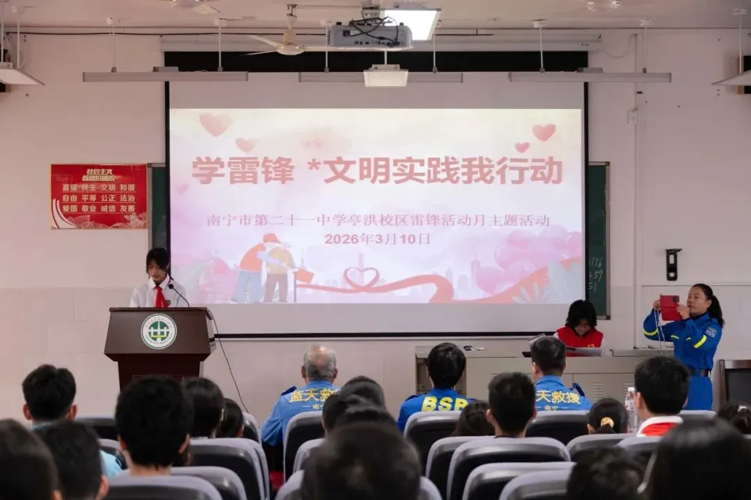 三月春风沐校园,雷锋精神永相传。2026年3月10日,南宁市第二十一中学亭洪校区在五楼阶梯教室开展“学雷锋*文明实践我行动”志愿服务专题讲座,初一、初二优秀少先队员代表及初三团员代表齐聚一堂,聆听救援故事,感悟志愿担当。