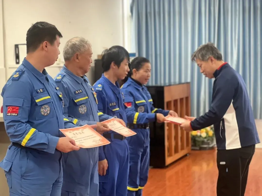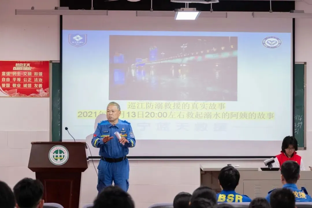 本次讲座特邀南宁蓝天救援队培训部副部长温知新主讲。温部长结合亲身经历,分享了多起邕江水域救援与抗洪抢险的真实故事:从2021年深夜巡江救起溺水群众,到2024年抗击特大洪水转移被困老人小孩,再到2025年北大桥防汛抢险。一幕幕惊心动魄的救援现场、一句句朴实有力的讲述,让同学们直观感受到救援队员“少说多做、默默奉献、完善自我、善待他人”的蓝天精神。