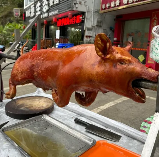 重点推荐:烤乳猪。做法极讲究,选七八斤的小猪,去骨腌制。用炭火慢烤,边烤边刷油和蜂蜜,火候是关键,得烤到皮色金黄,敲起来"咔咔"响。咬一口,皮脆得像饼干,肉汁锁在里面,"呲"一下冒出来,香得霸道,一点不腻。