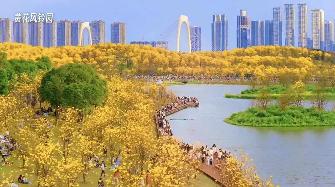 黄花风铃花神,无叶衬托,满树纯粹的金黄,荡漾出一大片壮阔的花海,春风吹拂,金色波浪绵延起伏,热烈奔放。枝头花儿朵朵,宛如风铃,在风里摇曳,仔细听,能听到乐音般的脆响,那是缠绵悱恻的春日序曲。可惜花期不长,三月中已近尾声,这首明亮又治愈的限定情诗,是大地献给春天的华丽序章。