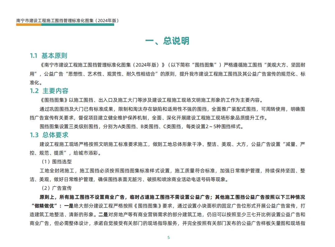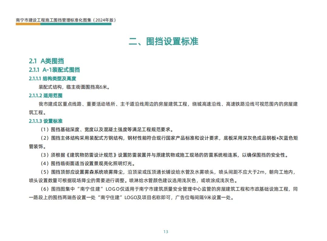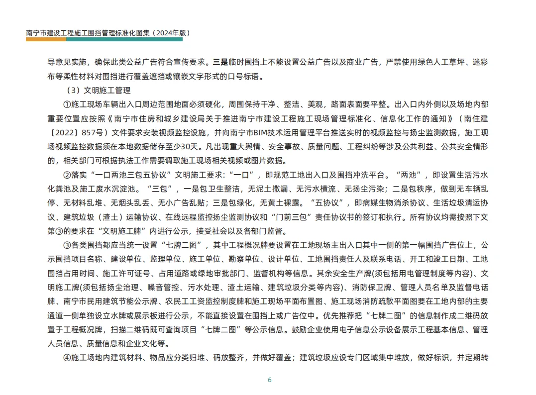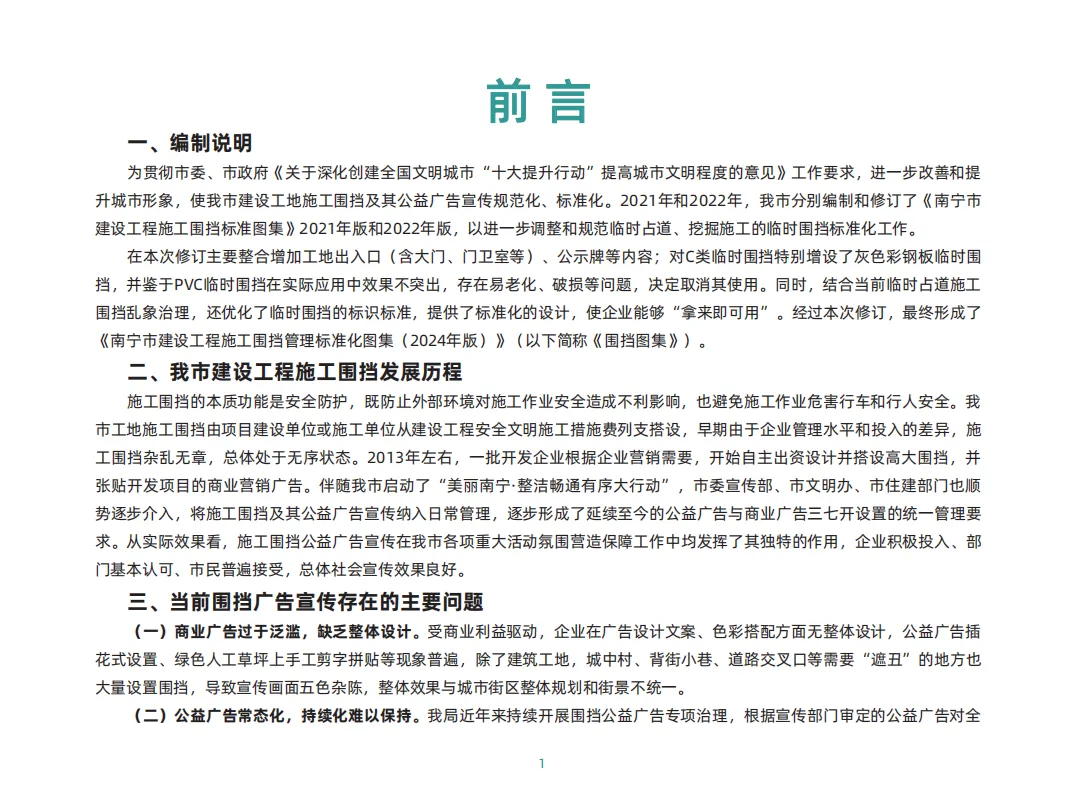 为了进一步改善城市形象,告别以往围挡杂乱无章、广告五花八门的乱象,南宁市住建局正式发布了《南宁市建设工程施工围挡管理标准化图集(2024年版)》(以下简称《围挡图集》)。