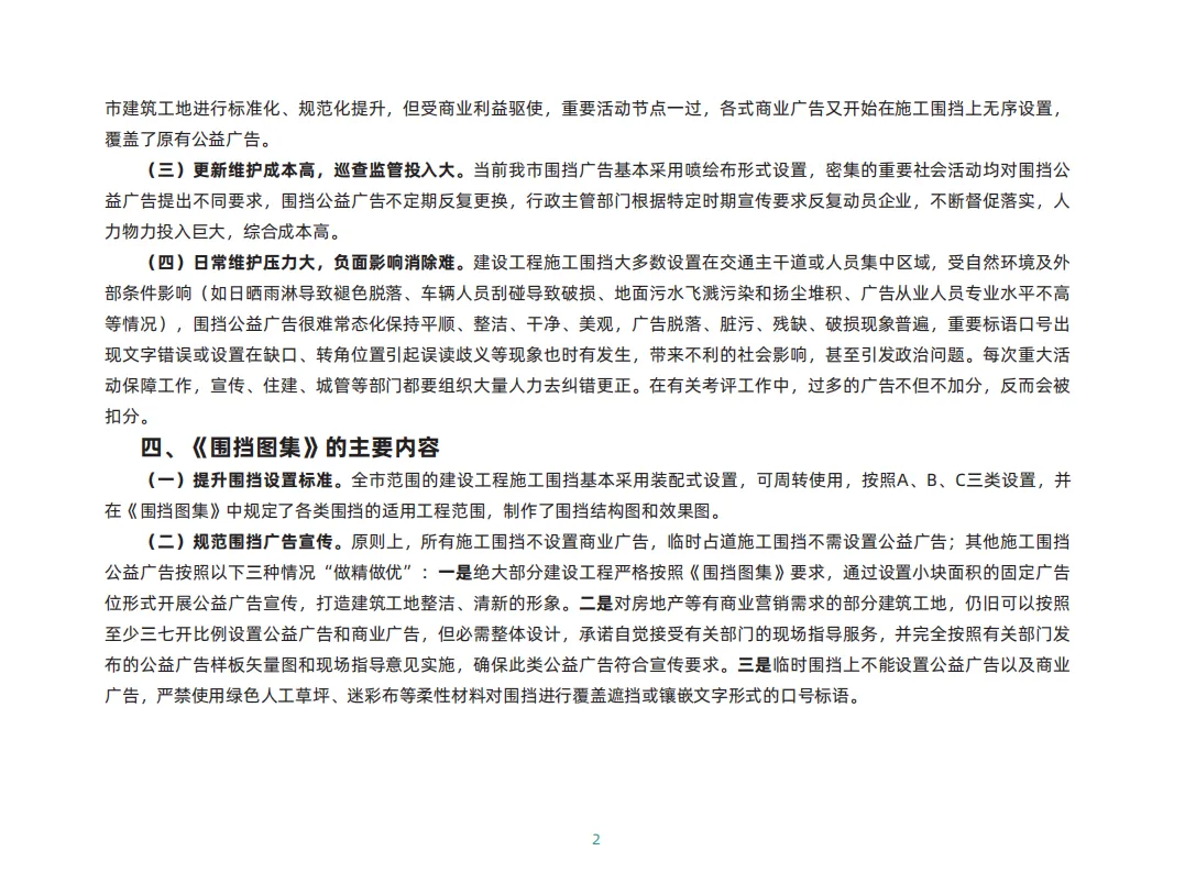 - 公益广告“做精做优”: 原则上不设置商业广告。对于房地产等有营销需求的工地,公益广告与商业广告比例必须严格保持3:7,且必须整体设计,不能随意拼贴。