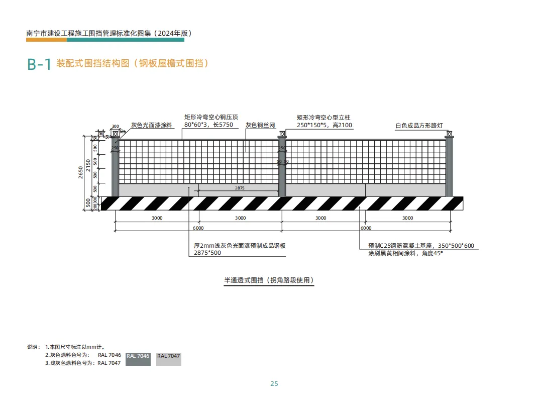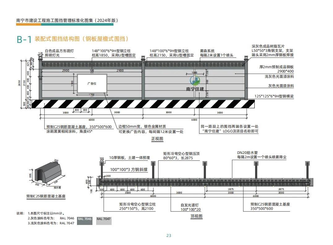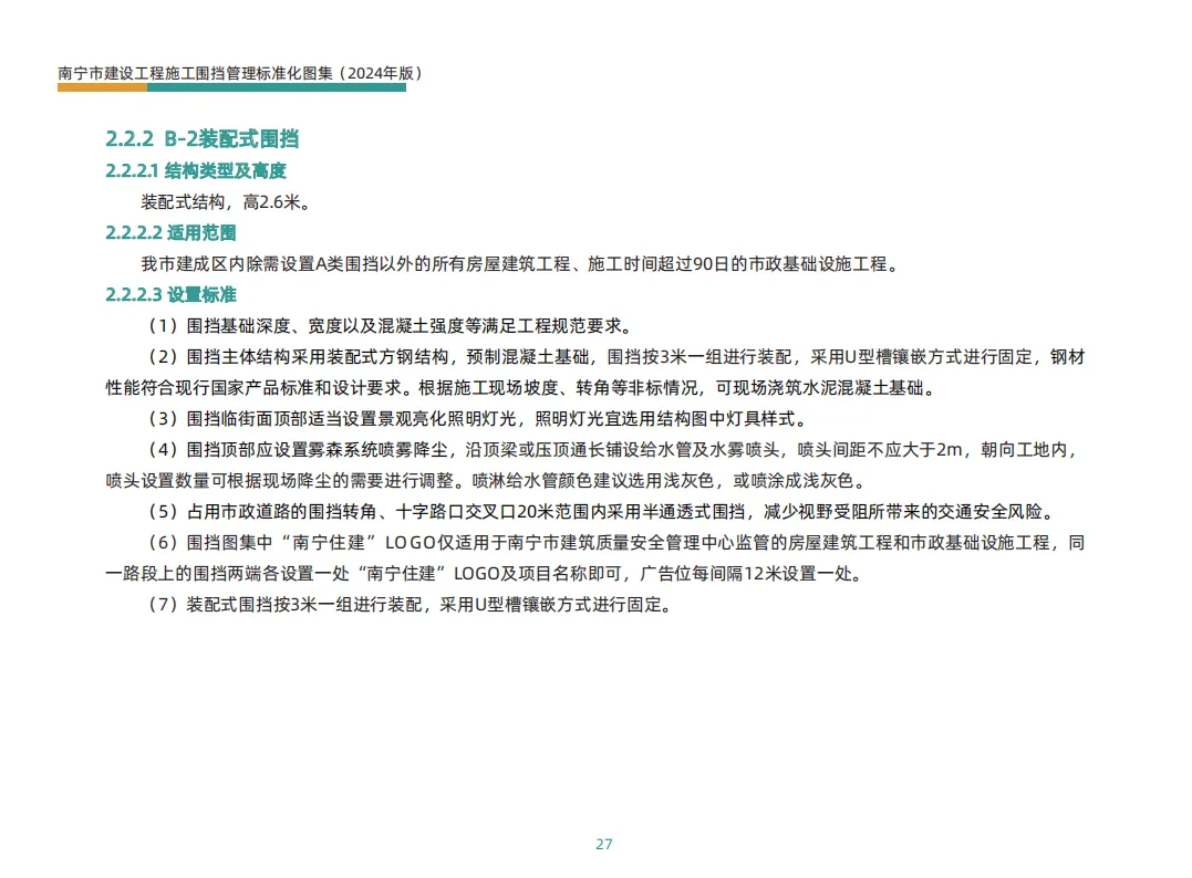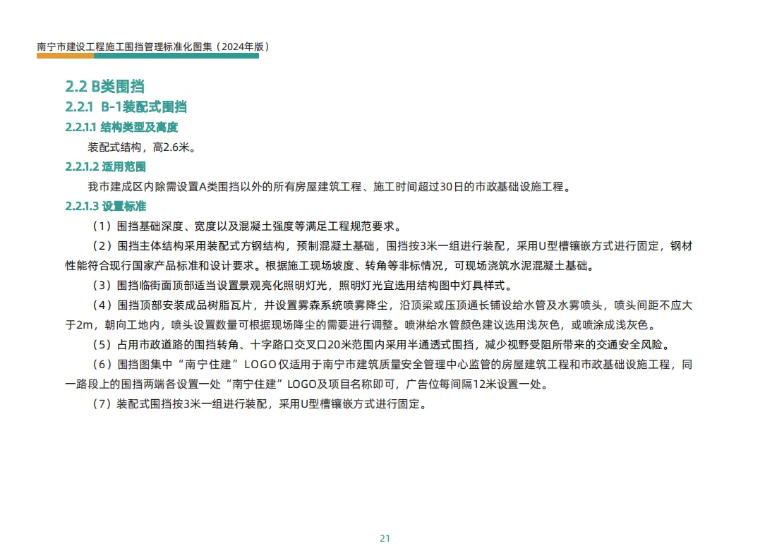 | B类围挡 | 一般房屋/市政工程 | “标准化”:高度2.6米,装配式或砖砌,顶部设树脂瓦和喷淋,转角处需半通透。 |