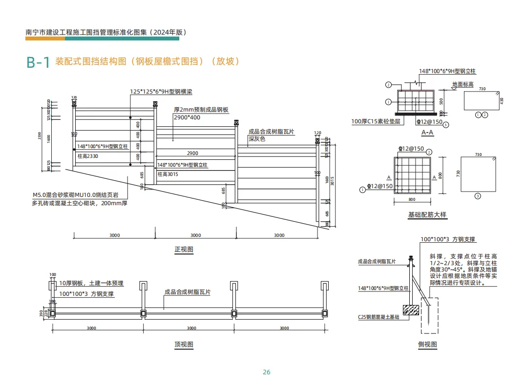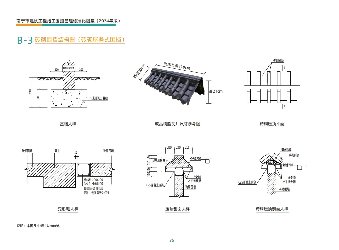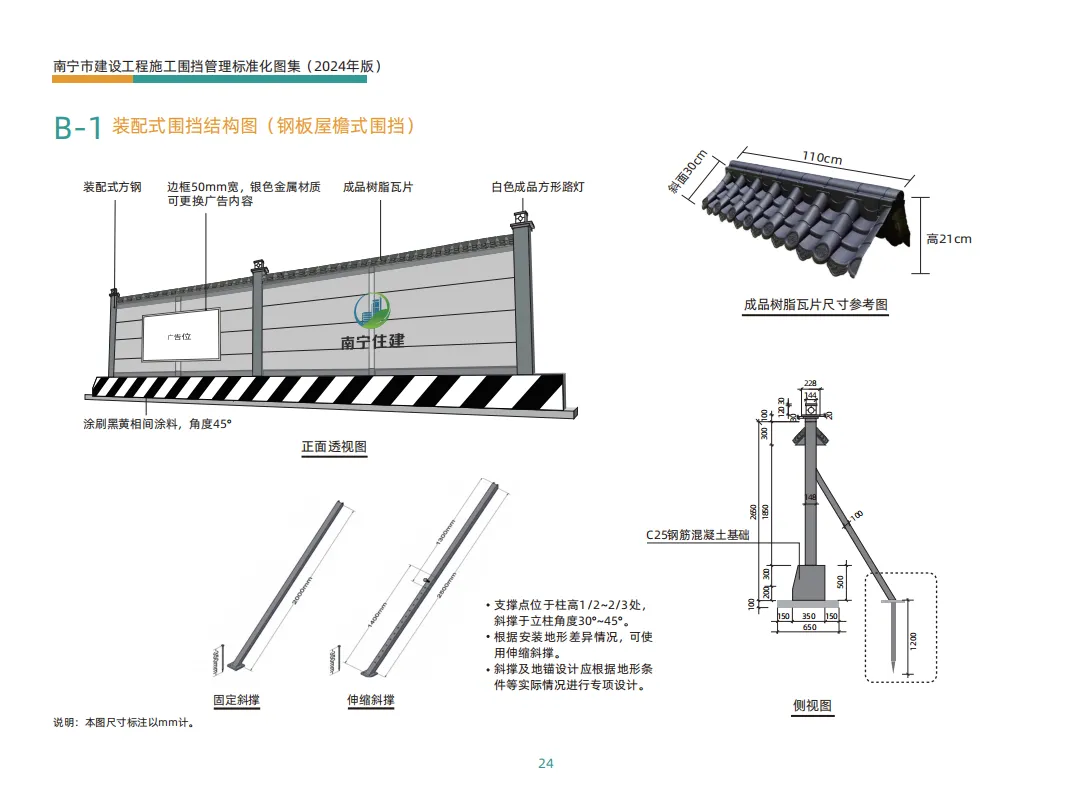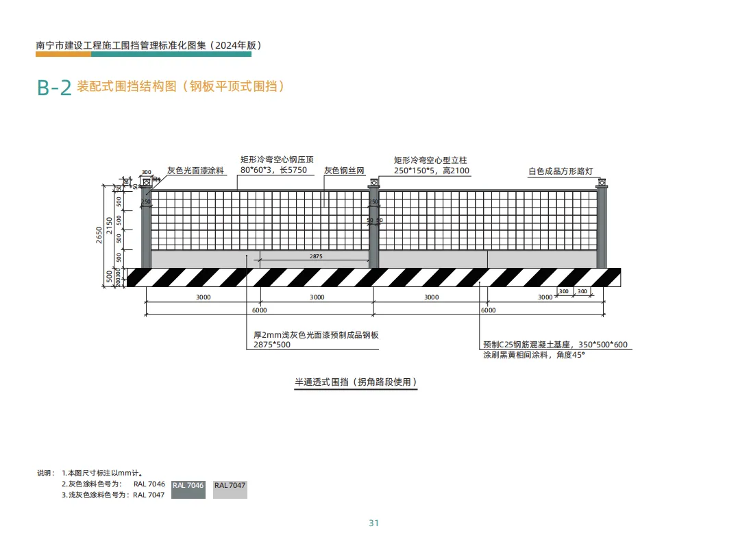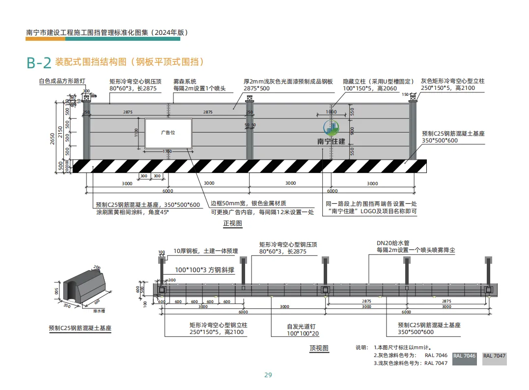 | B类围挡 | 一般房屋/市政工程 | “标准化”:高度2.6米,装配式或砖砌,顶部设树脂瓦和喷淋,转角处需半通透。 |