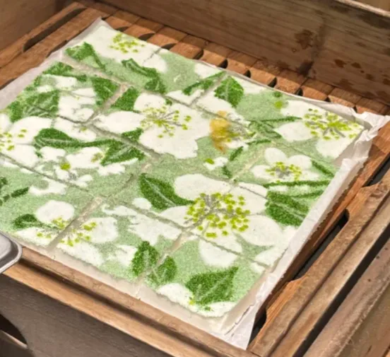 茉莉花糕做法也简单,糯米粉拌糖和少量清水,蒸到半熟时撒入茉莉花或拌入茉莉花茶汁,再蒸透。出锅放凉切块,口感软糯,带一口淡淡花香,适合当路上小点心。