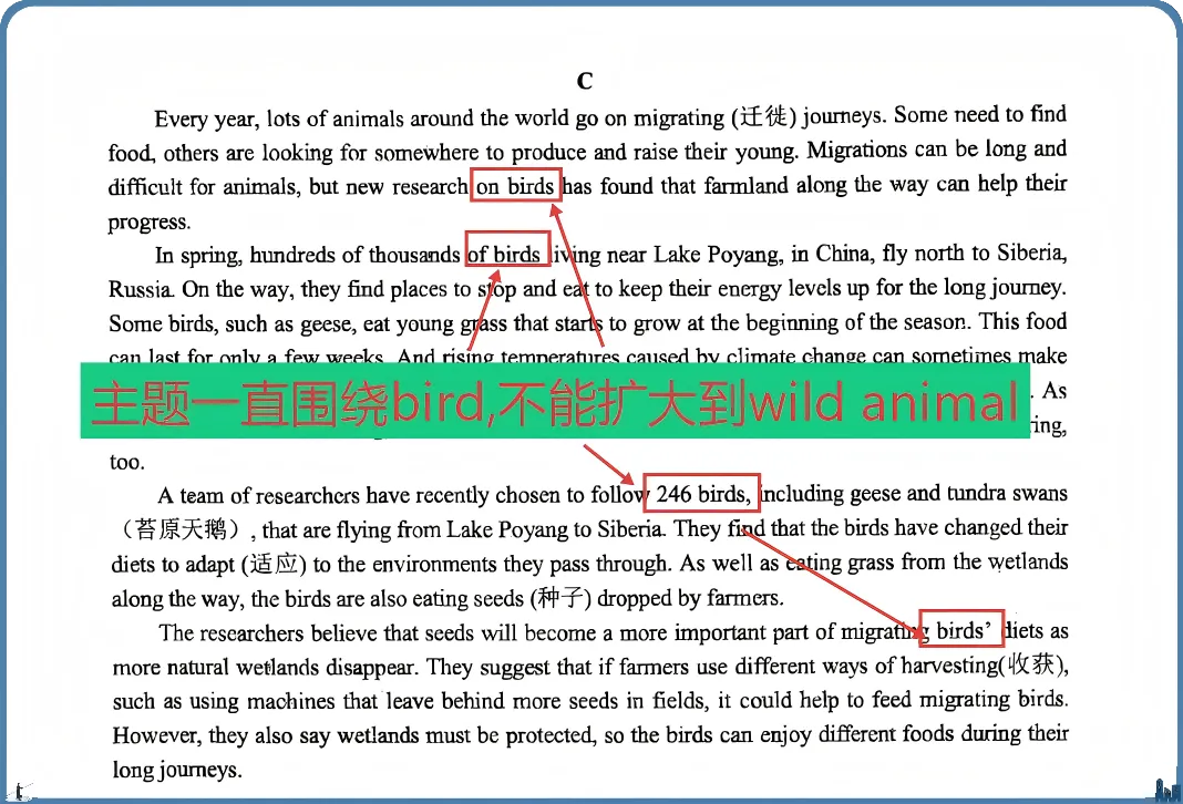 但是! 我们完全可以直接看出套路,范围扩大:选项把“birds”扩大成“wild animals”。那么可直接排除