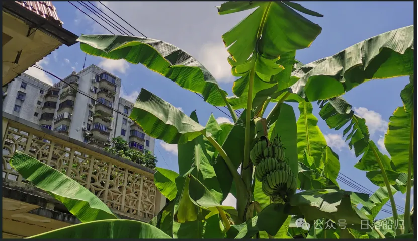 邂逅了一棵芭蕉树,感谢它宽大的叶子,让我能躲避酷热的阳光,也感谢它能向我展示挂在树上的芭蕉——以前我只在水果摊上见过。