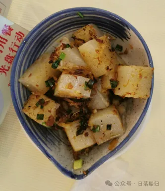 表面因为煎制而呈现出微微的金黄色,整体质地比较软糯,不会轻易散开。XO 酱为萝卜糕增添了一些海鲜味和淡淡的辣味。作为原料之一的米浆,有种淡淡的米香。先是感受到萝卜糕的软糯,接着是 XO 酱带来的鲜美和辣味,最后是萝卜的清甜,味道很好。