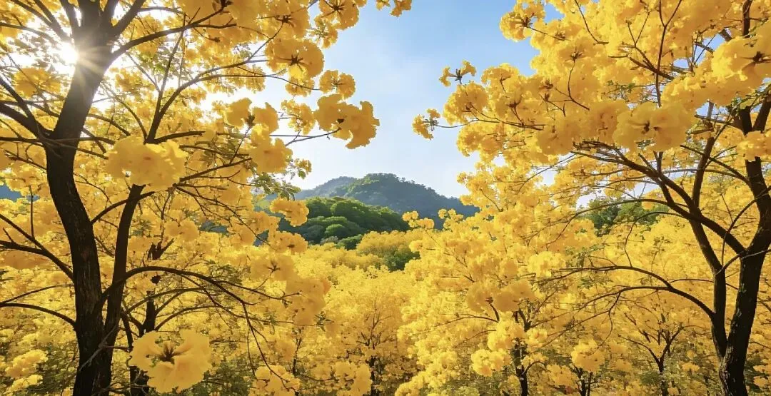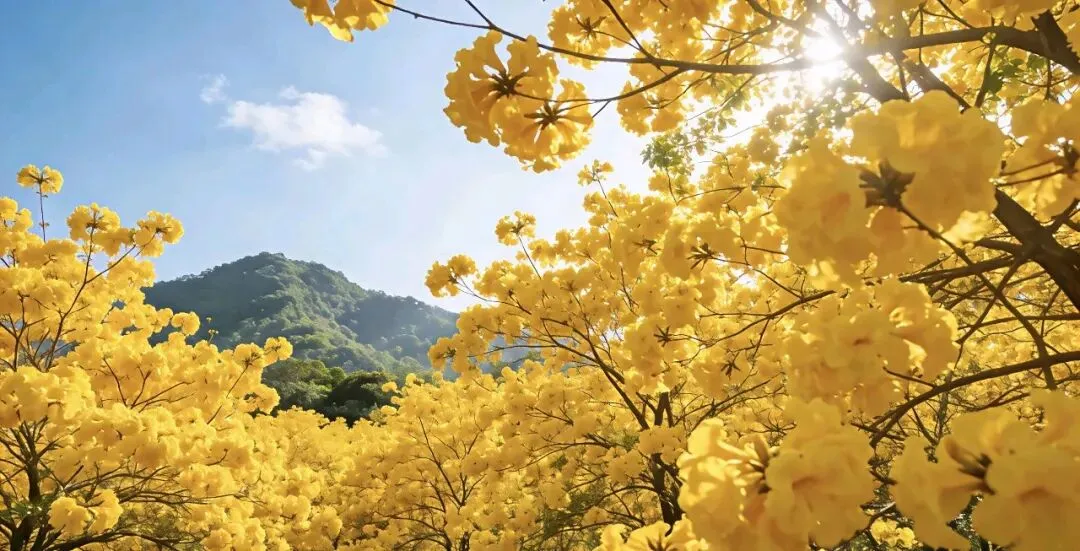 远山含黛,繁花似锦,黄花风铃木肆意舒展花枝。