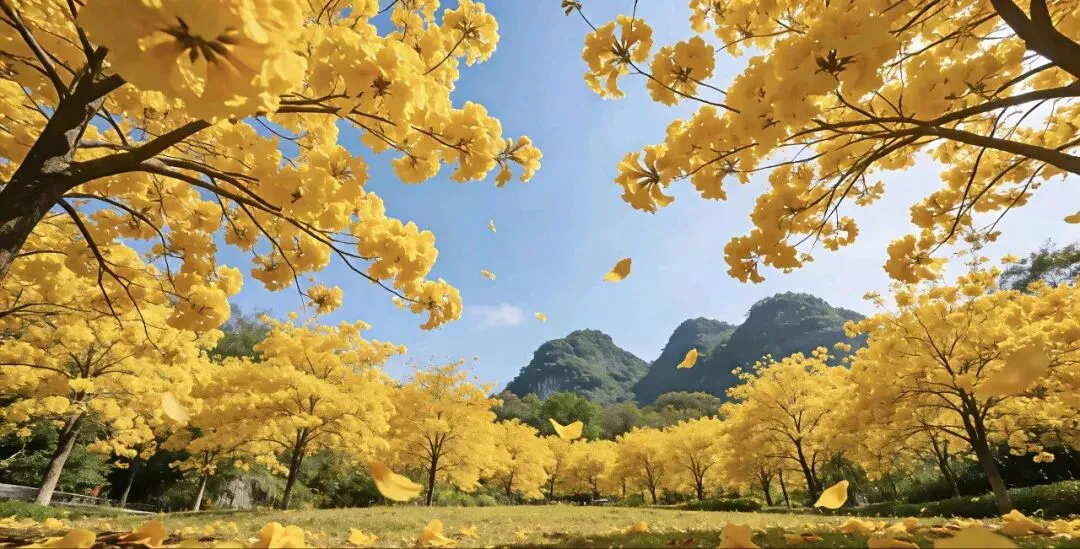 花瓣随风轻扬,落在草地、枝头,满目金黄撞入眼底,是独属于南宁的春日限定浪漫。