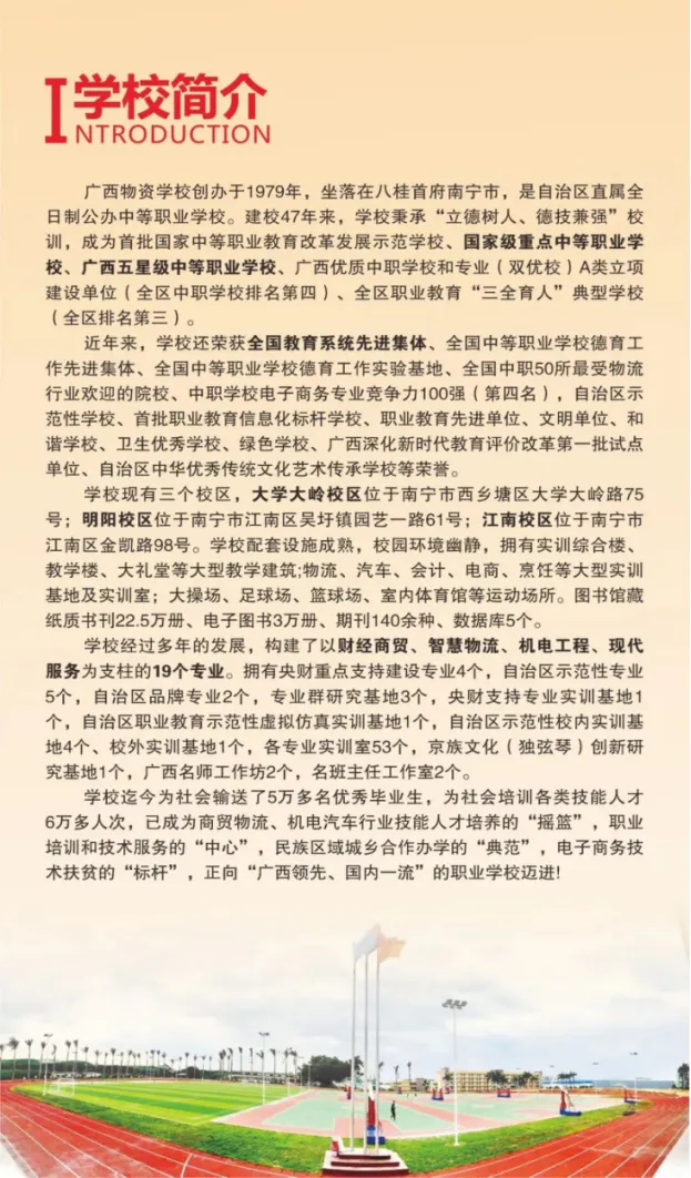 广西物资学校报读分数要求:中考出成绩前不看分数,中考出成绩后从高到低录取,择优录取,录满截止,故每年的分数要求不一样,所以家长要提前给孩子预定名额!