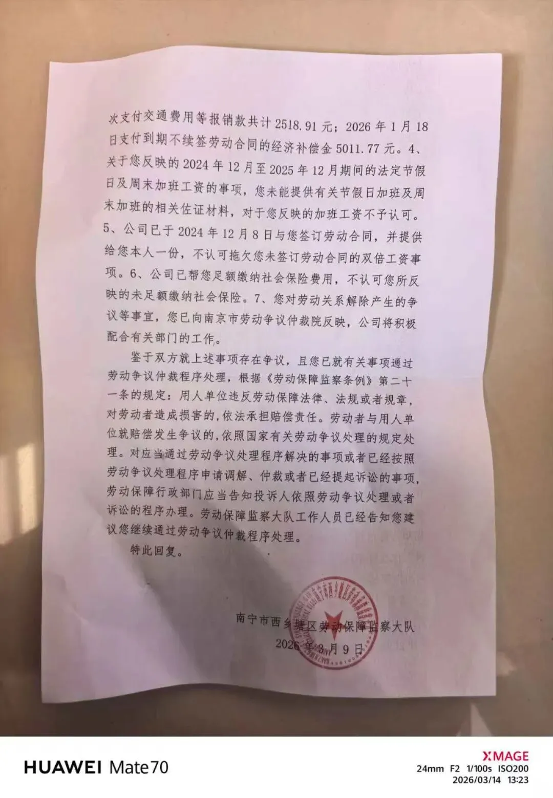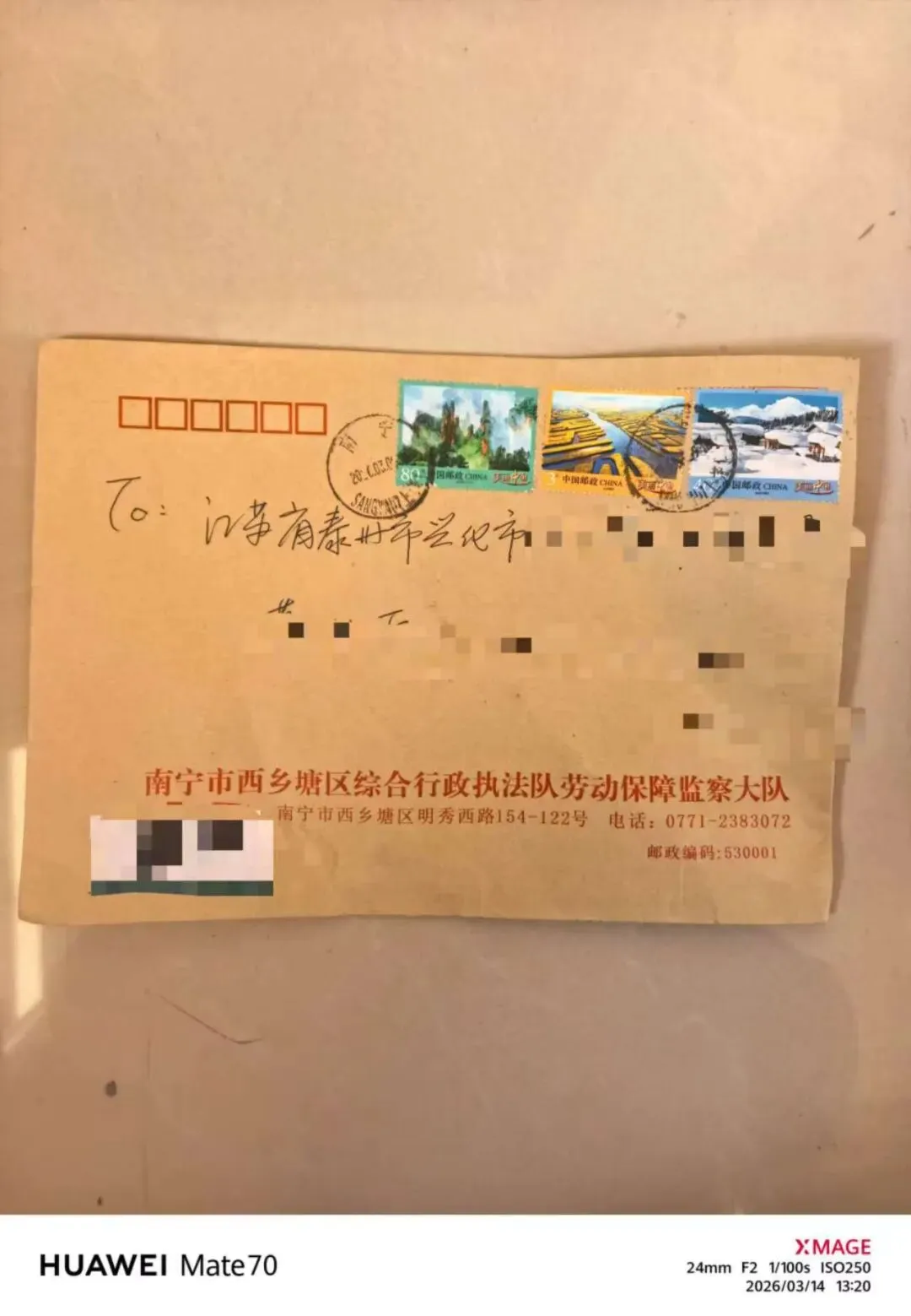 南京市雨花台区劳动监察不处理。理由是矛盾发生在广西南宁。