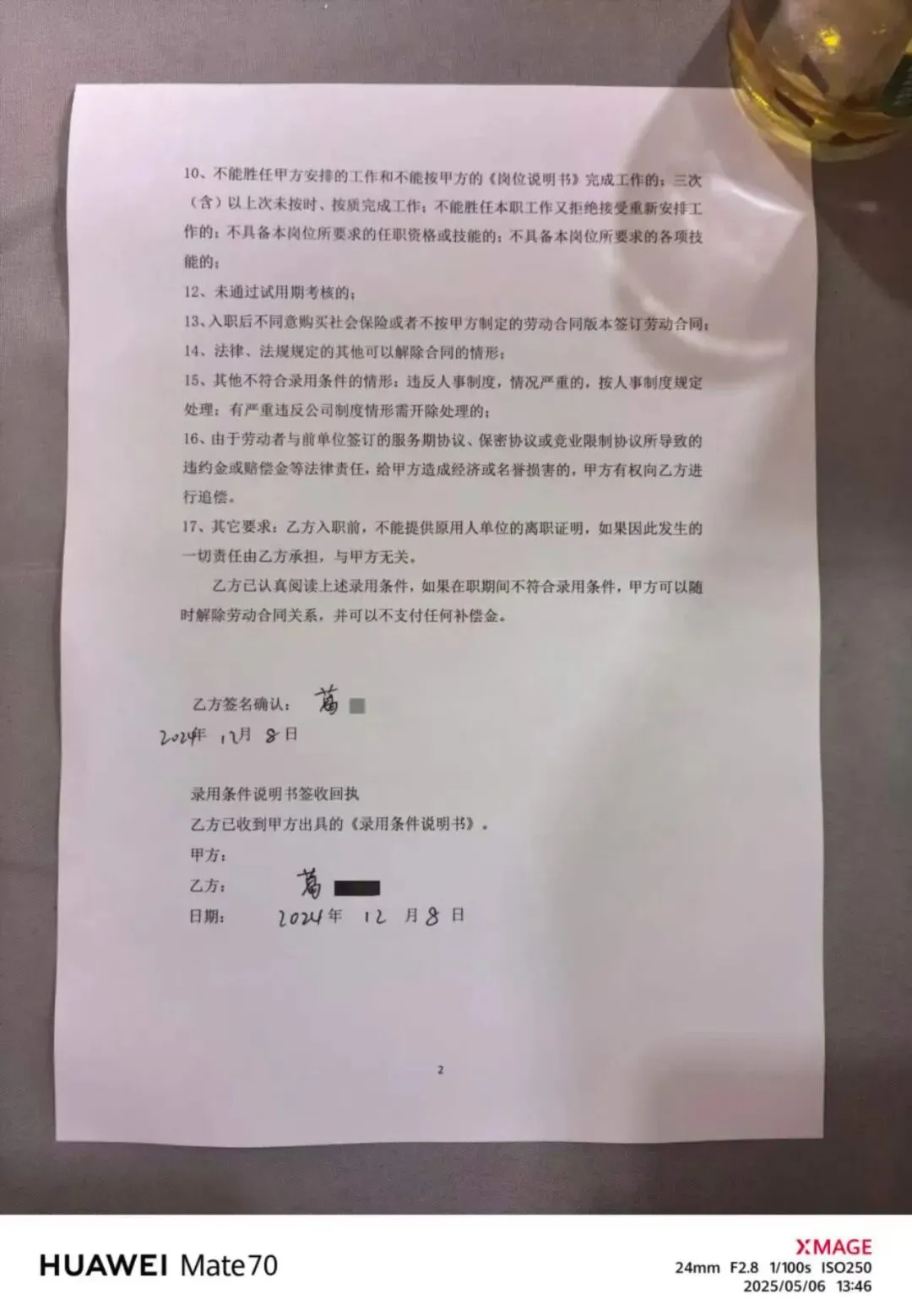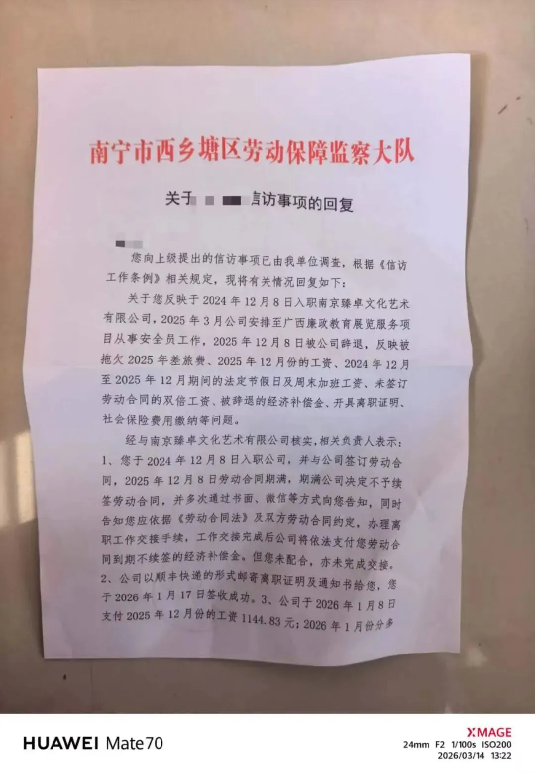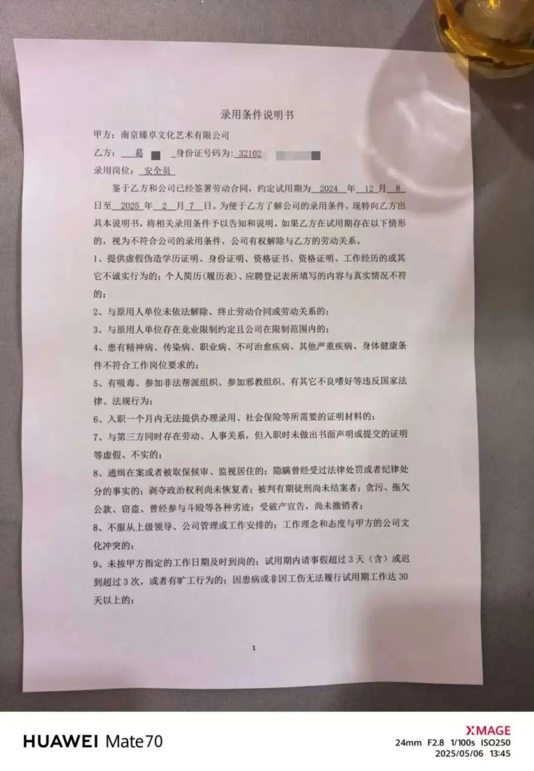 实际南京臻卓文化艺术有限公司2024年12月8日根本没有跟我签订劳动合同。更谈不上给我一份。
