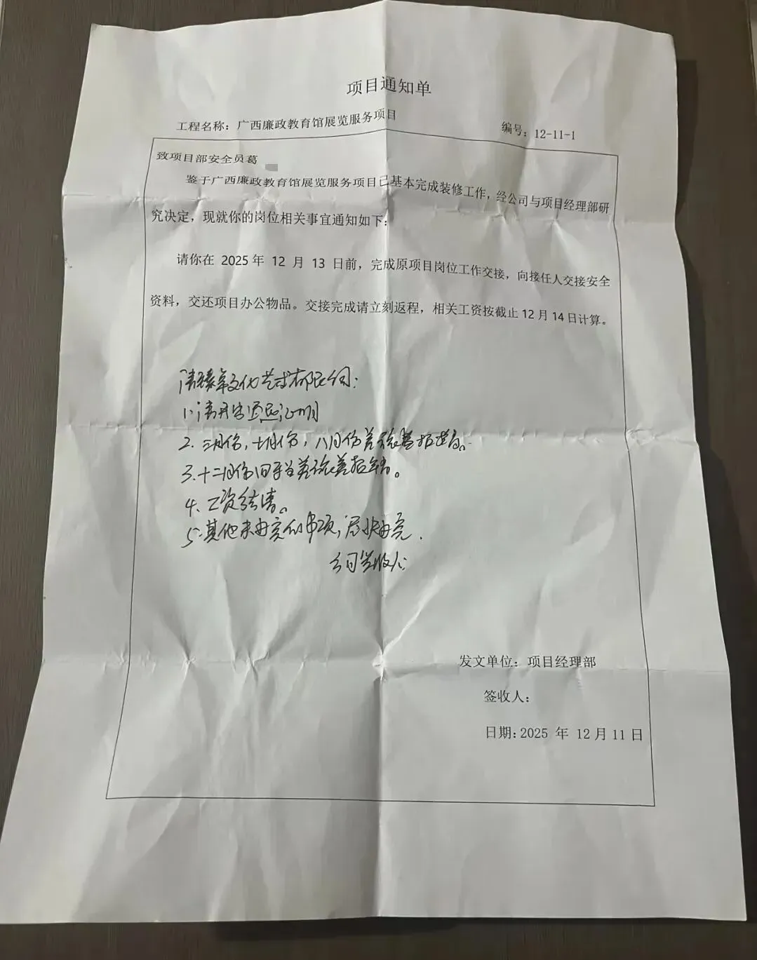 我强调是非法辞退我。项目经理薛某2025年12月11日给我这单子。要求我2025年12月13日前完成交接,结算到2025年12月14日。我2025年12月12日完成交接,12月14日晚交出安全帽,门禁卡,保险柜钥匙。12月15日开的。