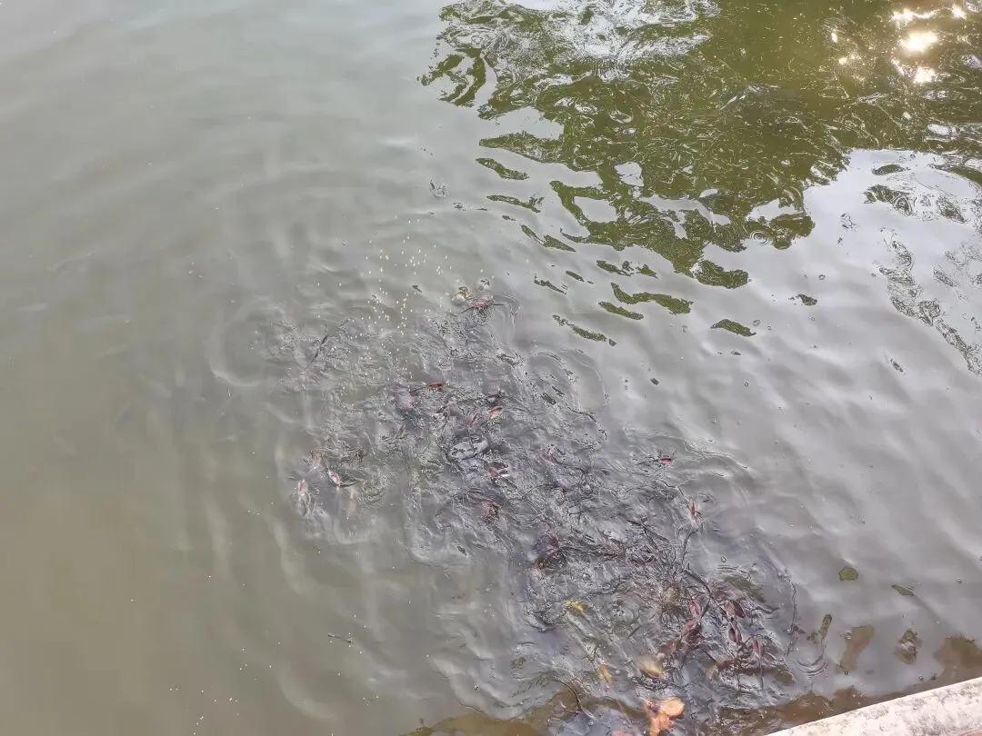 他们接过鱼食,撒向清流湖中,一条条鲶鱼和罗非鱼浮出水面,张开大嘴享受起这久违的美味。