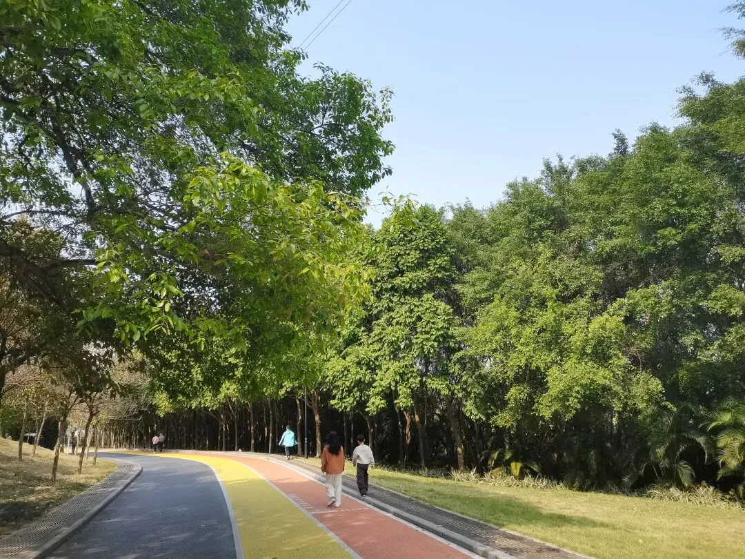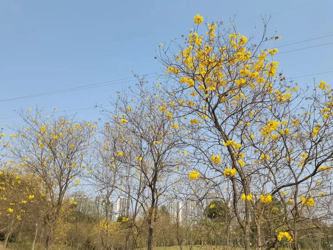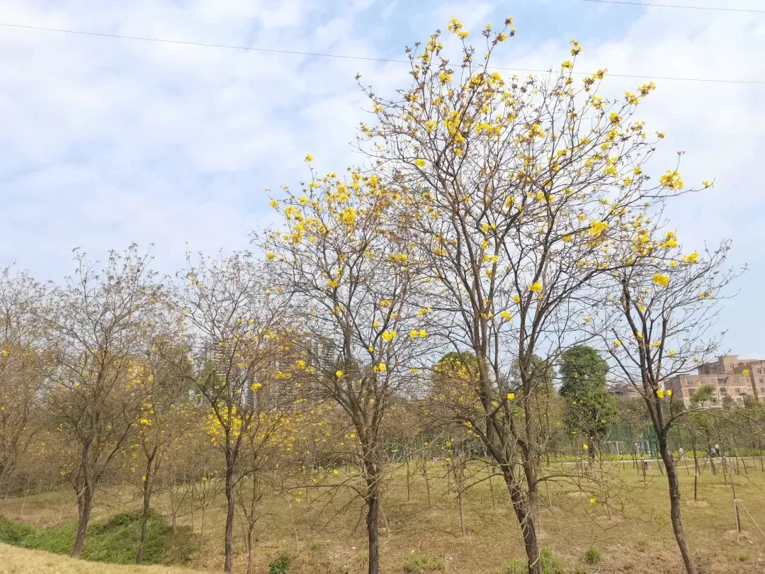 沿着步道向前,一棵棵黄花风铃木树映入眼前。此时盛开期虽已过,一撮一撮的黄挂在树上,点缀着公园,别有一番景致。