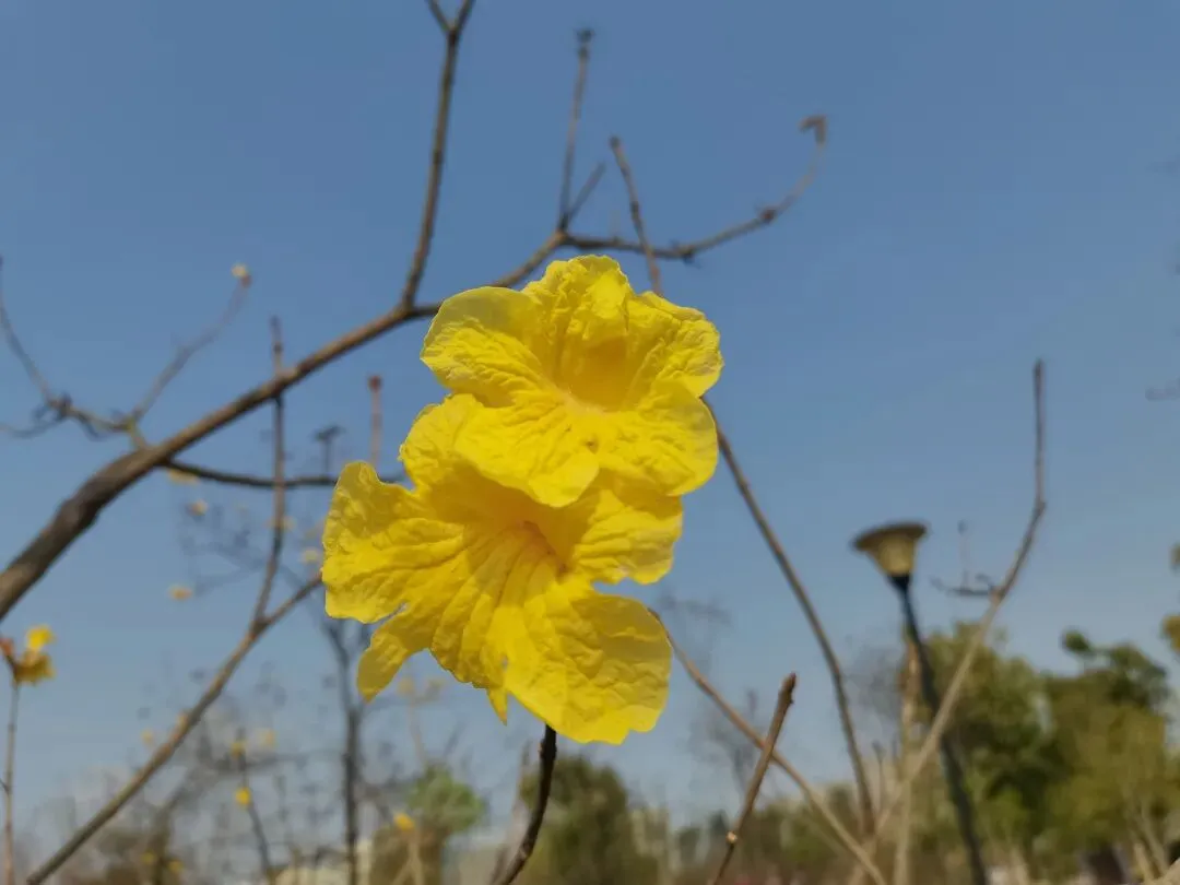 凑近一看,明艳的金黄色,花冠呈漏斗形,外形酷似风铃。花朵边缘略有褶皱,质感细腻,在蓝天的映衬下显得格外耀眼。