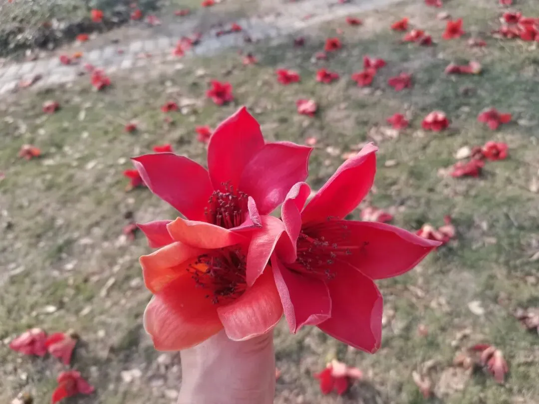 我随手捡起三朵,手心的木棉花瓣厚实质感,红得纯正浓烈。