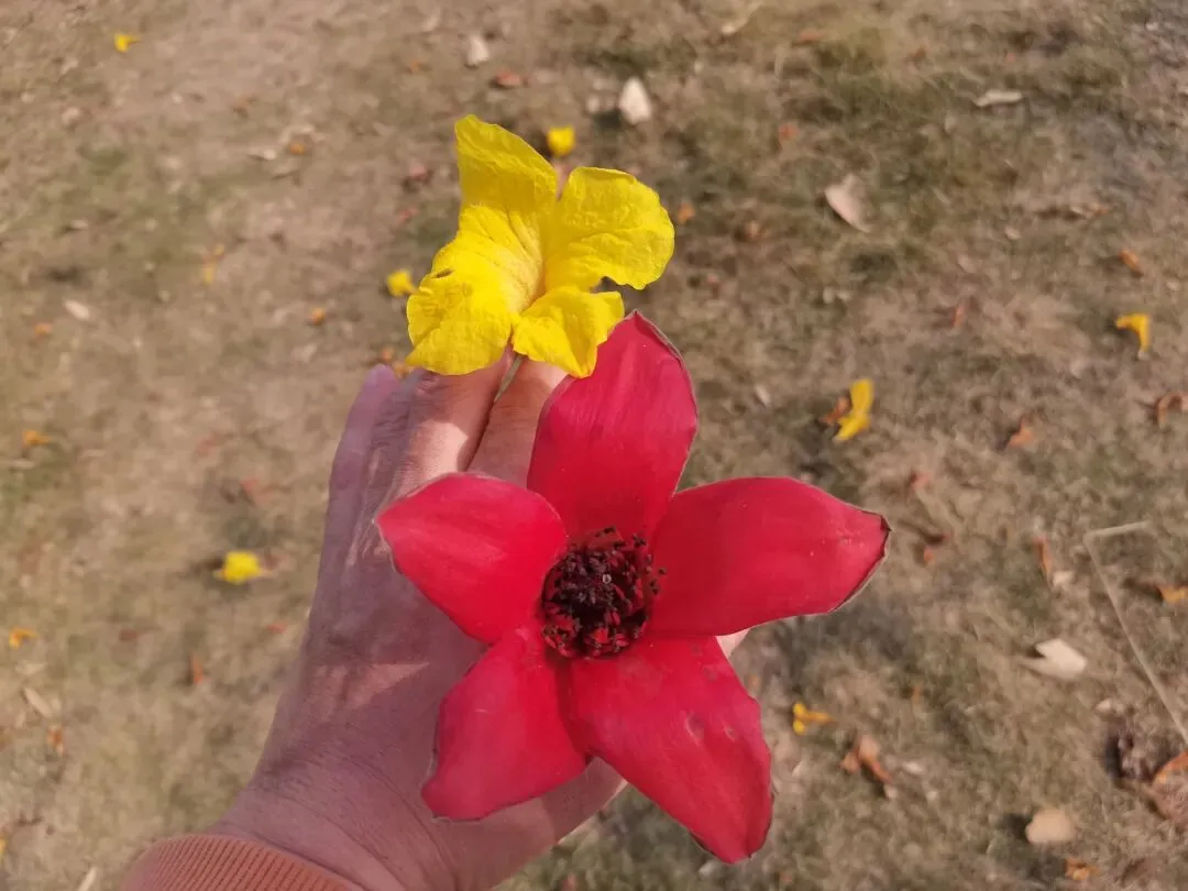我捡起地上的黄花风铃木和红色木棉花放在掌心,明黄与大红相互辉映,红与黄的撞色美得惊心动魄。