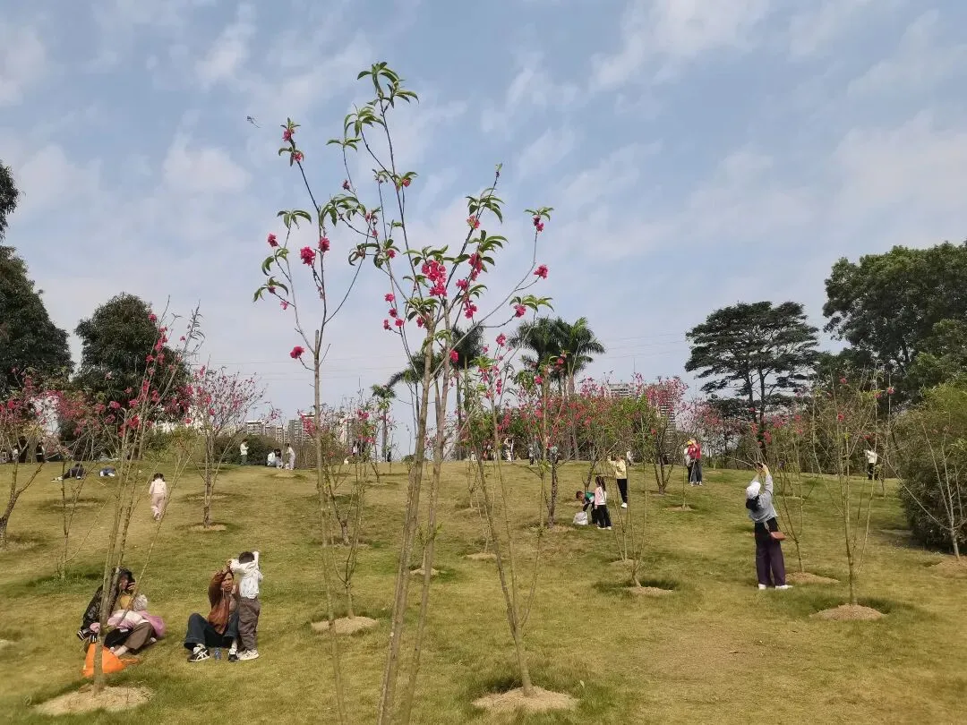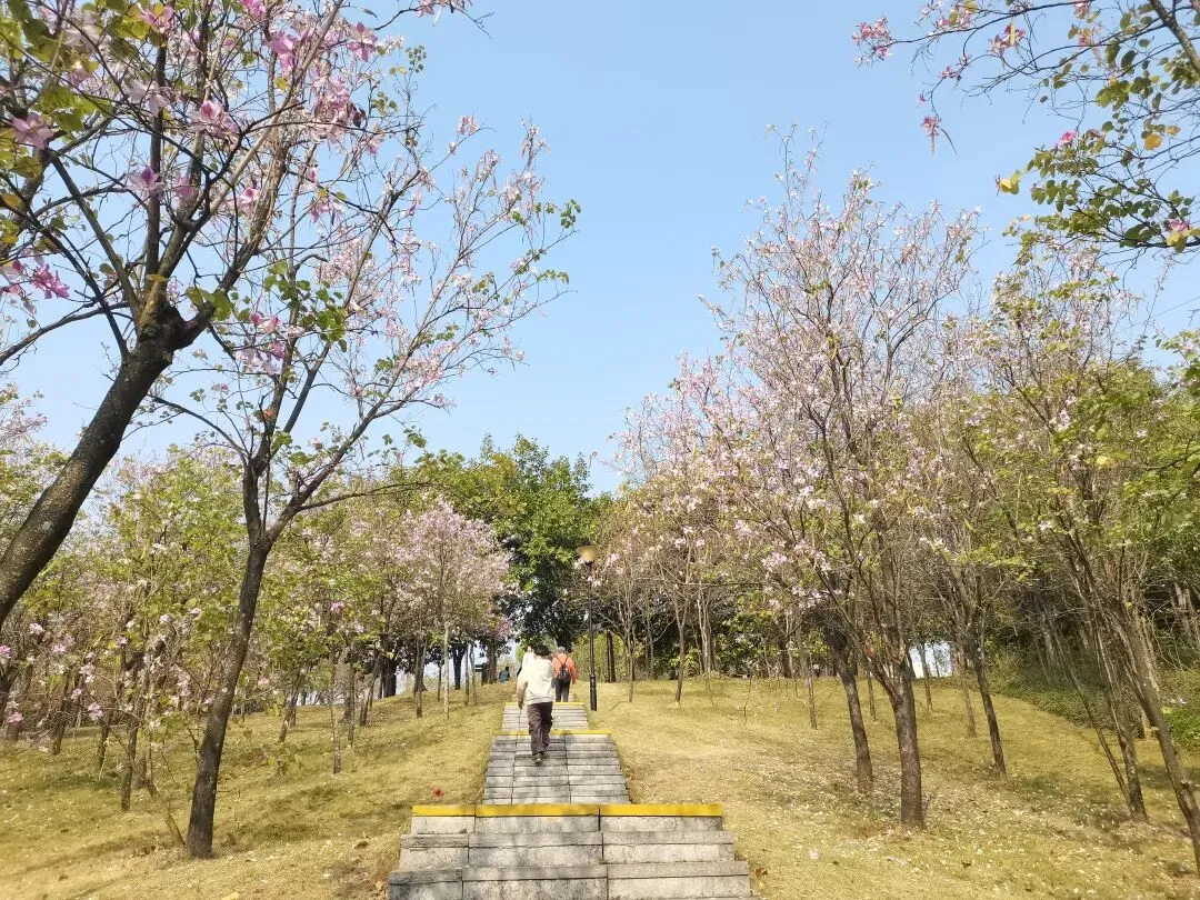 黄花风铃木的“清”,木棉花的“淡”,宫粉羊蹄甲的“甜”,桃花的“柔”,形成了江南公园最别致的美。