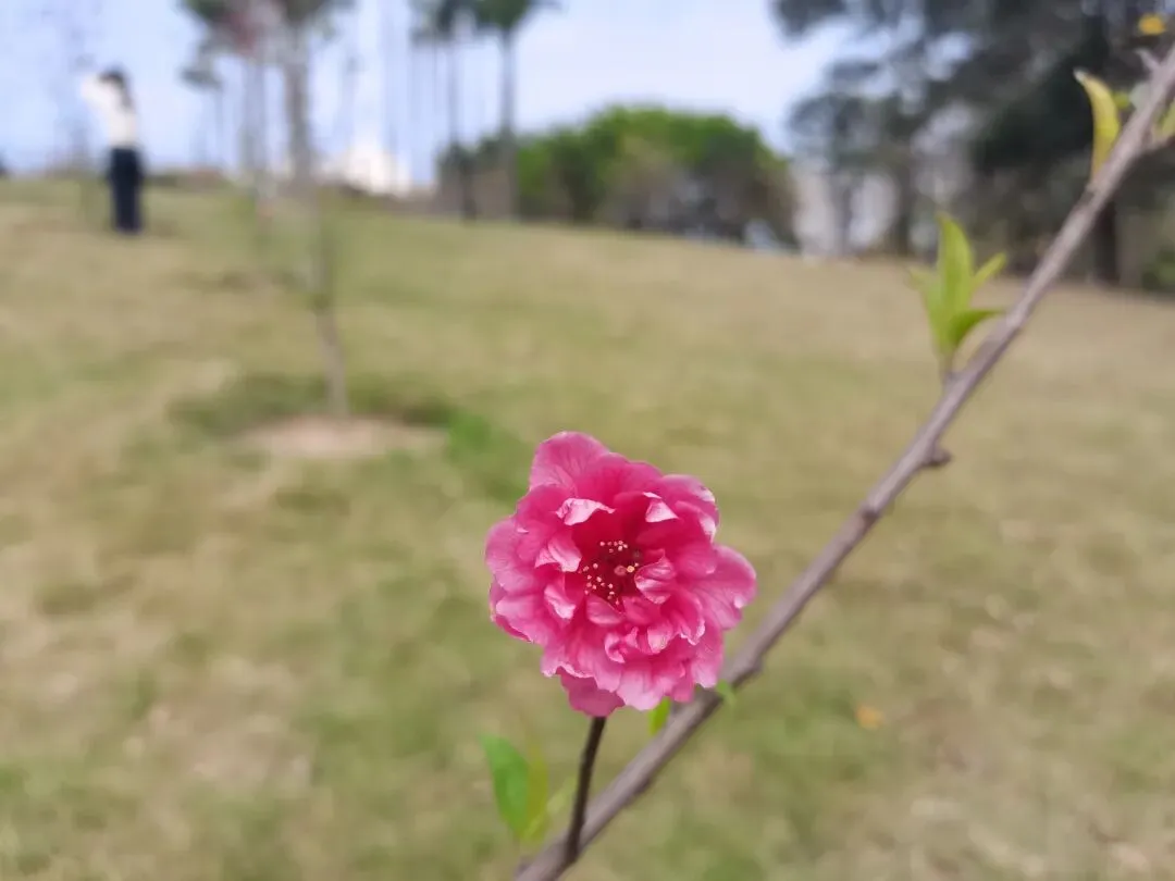 走入桃花区,枝条细长,新芽嫩绿,一朵朵桃花次第盛开,花瓣繁复饱满,远看像一朵朵微型的牡丹或月季,红艳艳的,颜色饱和度极高,像胭脂般艳丽。