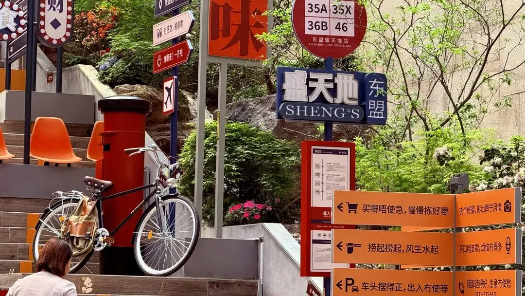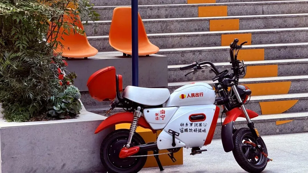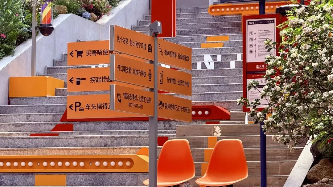 首先是“南宁白话”的指示牌,其次就是南宁“特产”人民出行共享电动自行车,外加位置地标名字,南宁的信息量充盈。