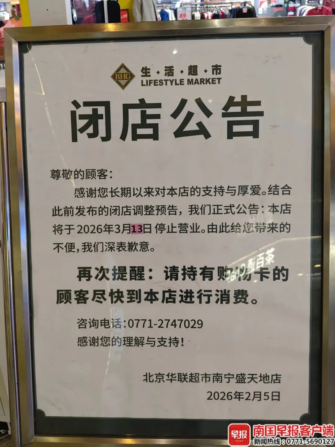 12日下午4时许,记者来到南宁市东盟盛天地购物中心B1层,在华联超市入口处看到一则2月5日发布的闭店公告,称该店将于2026年3月13日停止营业,提醒持有购物卡的顾客尽快到店进行消费。
