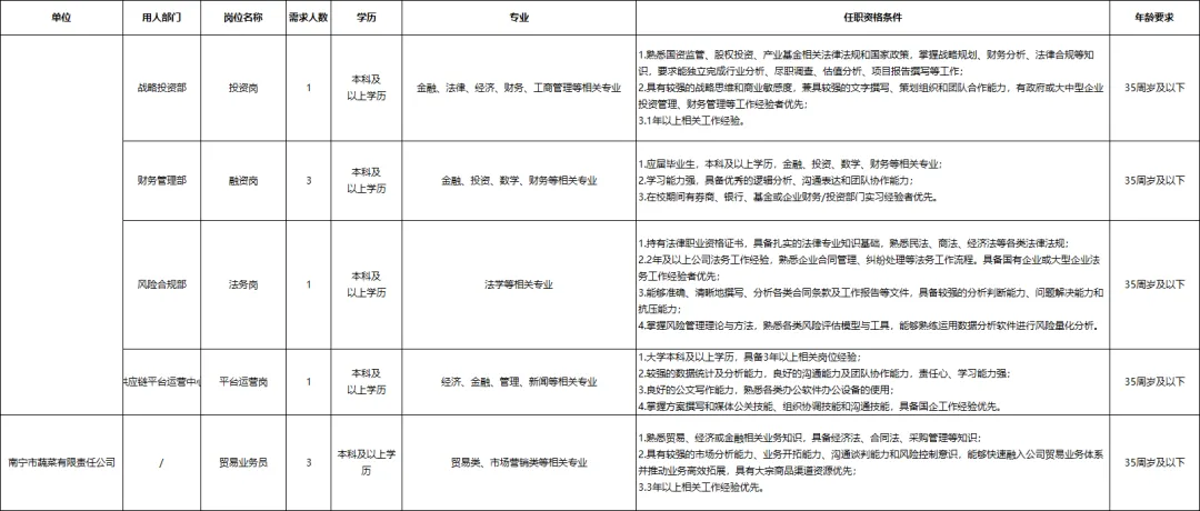 南宁供应链集团现因业务高速发展需要,公司本部及下属企业诚邀各类优秀人才加盟,公司提供完善的激励晋升机制及广阔的发展空间。热忱欢迎有志之士加盟。招聘岗位、人数及岗位要求详见附件。