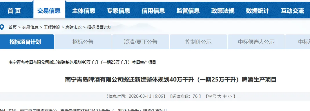 重磅!南宁市中心这家老牌啤酒工厂将真正迎来异地搬迁了!近日,三则招标公告吸引了不少人的关注,这三则招标都跟同一个项目有关,那就是南宁青岛啤酒有限公司搬迁新建整体规划40万千升(一期25万千升)啤酒生产项目,此次招标包括施工招标、项目设计招标和项目监理招标。