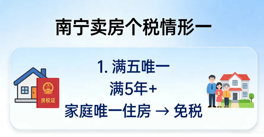 3. 最省钱的情况:房子满了5年,而且是家里(夫妻加未成年孩子)在广西的唯一住房,个税全免。
