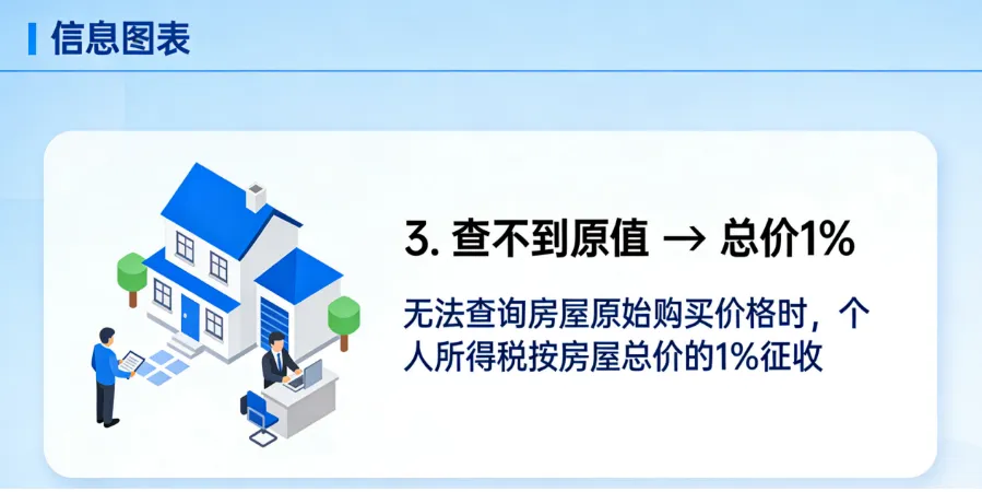 官方定义是你既拿不出买房的合同、发票,税务局的电脑系统里也查不到这套房子以前交易的记录,说白了根本算不出你当初花了多少钱。