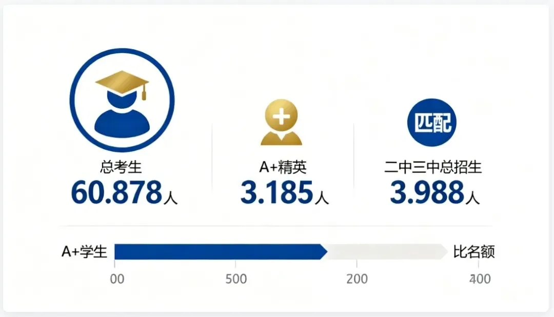 从上图可以清晰看出:2025年市区参考人数60,878人,A+等级考生共3,185人(约5.2%),而二三中总招生计划为3,988人。这意味着A+考生数量与二三中招生计划基本匹配,是冲刺二三中的核心门槛。