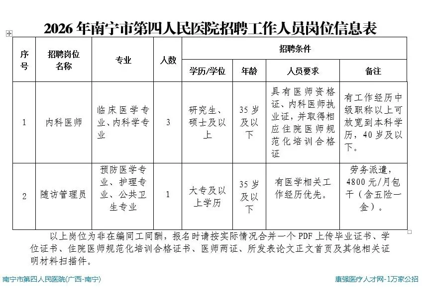 南宁市第四人民医院人才招聘信息【内科医师、随访管理员】