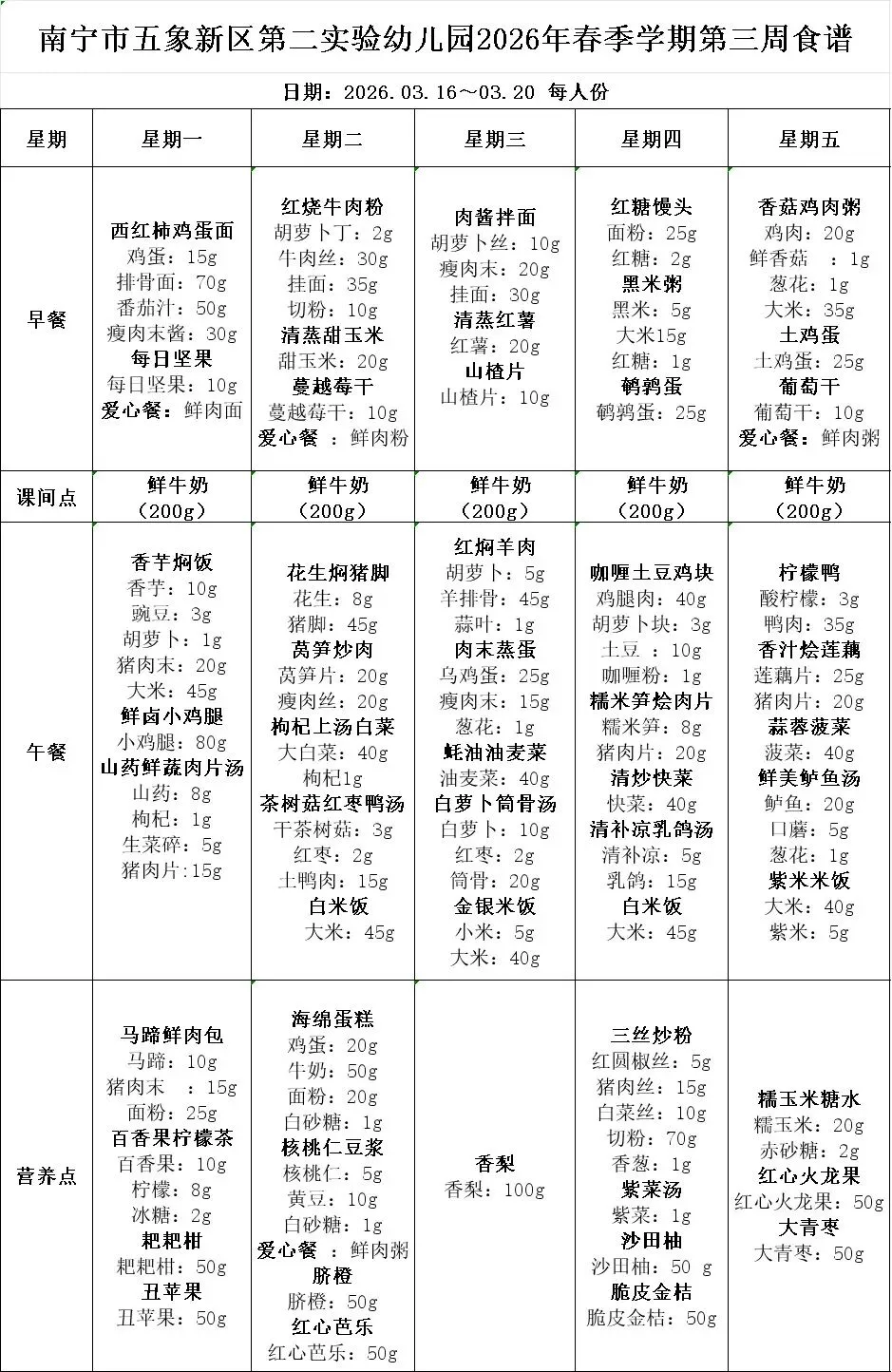 美好“食”光|南宁市五象新区第二实验幼儿园2026年春季学期第三周食谱 (2026.03.16~03.20)