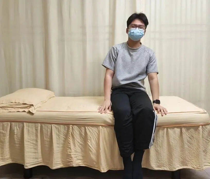 3.双腿沿床边放下, 用手臂支撑上半身,慢慢坐起,避免腰部用力,完成整个起床流程。