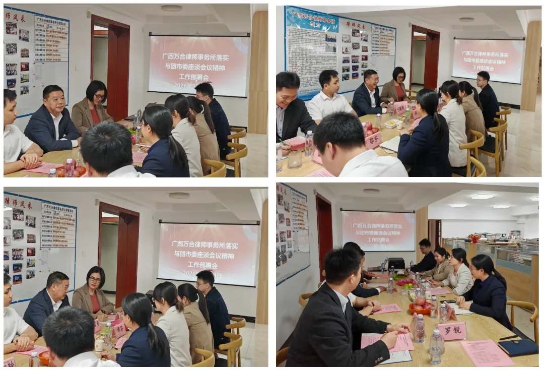 2026年3月13日,共青团南宁市委书记陈国栋一行走访广西万合律师事务所,并与广西万合律师事务所党支部书记韦晓斌,执行主任兰国乔以及蒙汗英、杨美芬、罗锐、谭芬、郭芬、梁智映等青年律师代表座谈。