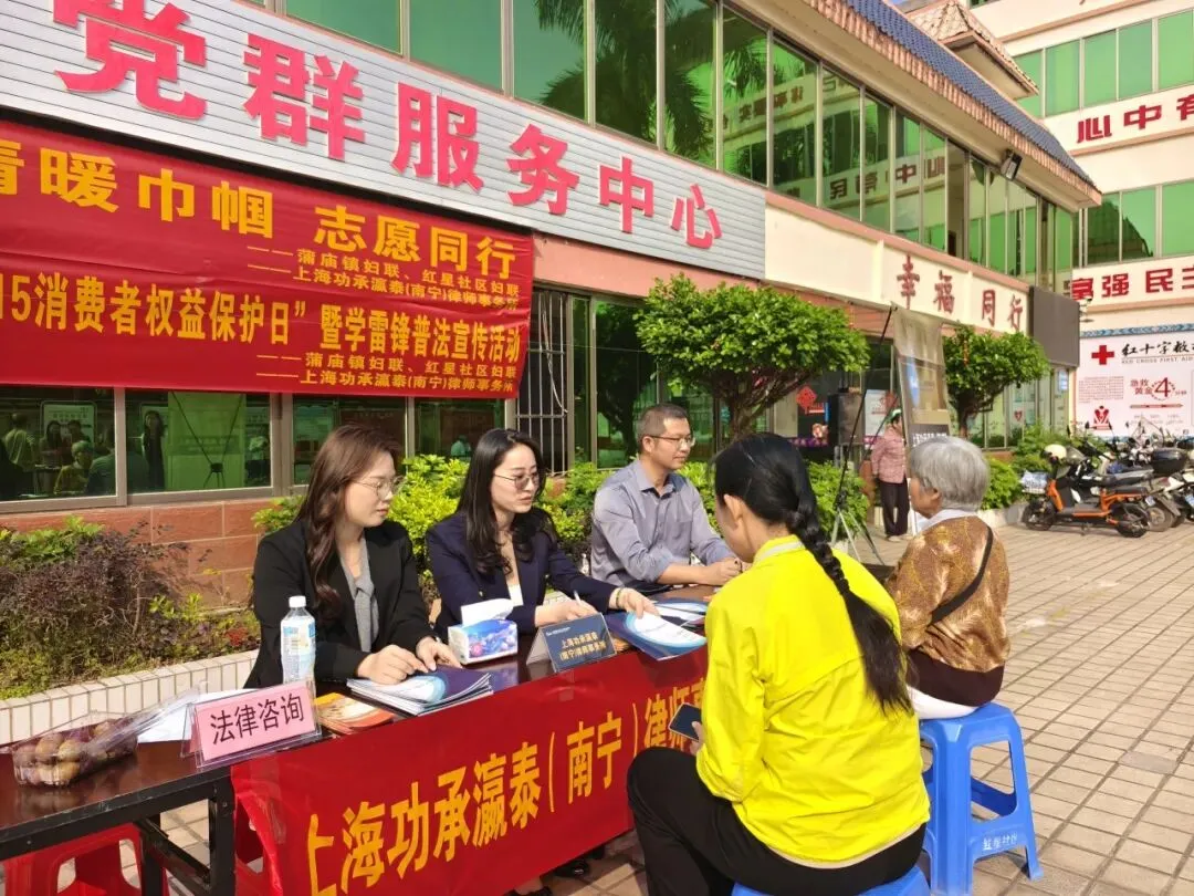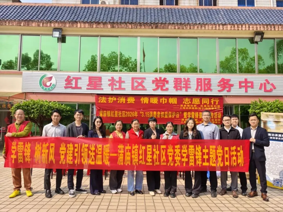 3月13日,功承瀛泰(南宁)律师事务所党支部携手蒲庙镇妇联、红星社区妇联,共同举办2026年“3·15”消费维权日暨学雷锋普法宣传活动,将法律服务送到群众身边,用实际行动传递法治温暖。