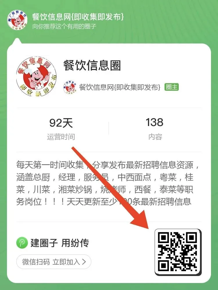 餐饮信息圈⭕,一个可以自由发布招聘 求职 信息推广 餐饮人的工作信息圈子,主要是发布广西区域,广东区域,日料寿司刺身和省内精选信息,公众号没有的,圈子里面都有,如果大家对于招聘信息资源需求比较多,可以选择点击下方小程序加入!圈内每天将第一时间收集发布100条以上最新招聘信息,目前定价是10元一个月,2个月18元,相当于0.3元/天,按月收!,每天花3个多小时时间管理维护。本质也是等价交换,如果觉得值,并且需要更多工作信息资源,可以扫一扫下方小程序加入一下吧!