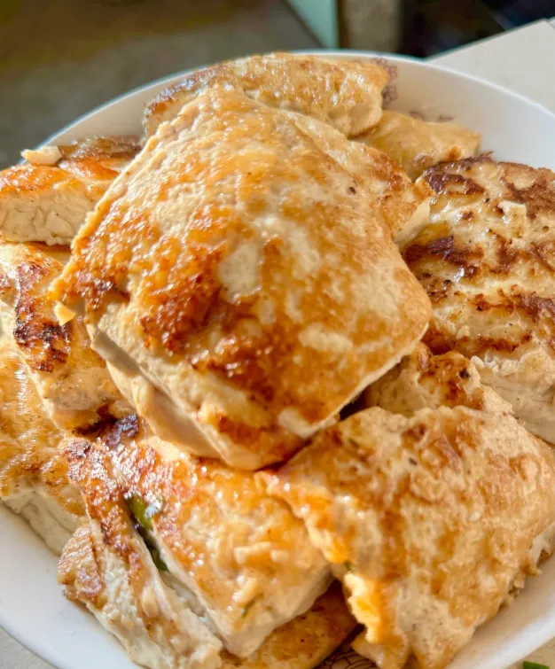 黄豆打浆、混猪肉末、葱花、蒜碎,手捏成团,下锅轻炸。外层金脆,内里松润。咬下去豆香和油香一齐蹿上鼻尖,舒服得不像话。