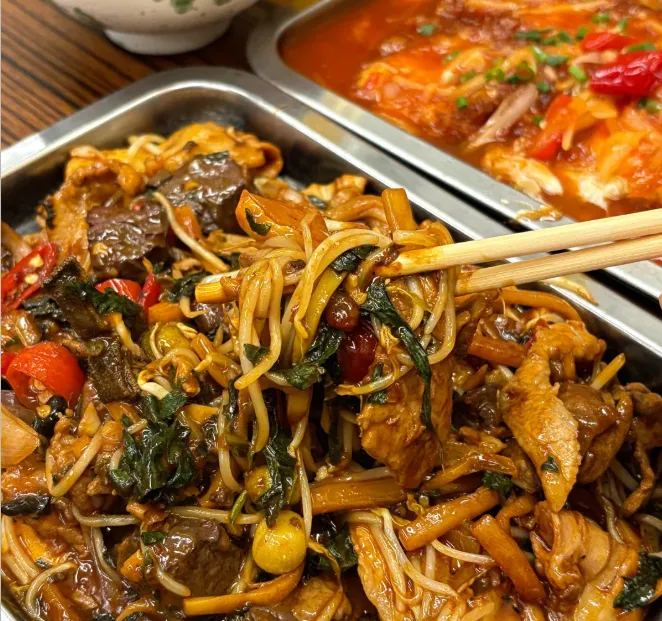 中午适合吃实在点。靠江一带常见河鲜,清蒸或酸汤煮,肉不柴,带点水气。想试地方味,可以点一份酸笋类的炒菜,味道是冲的,但不是呛,是那种把困意赶走的利落。