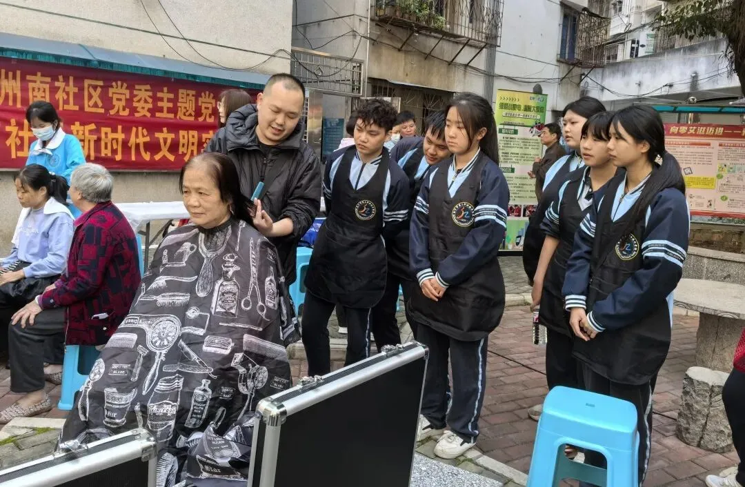 3月5日,望州校区“善思”志愿服务队与美容美发专业师生走进望州南社区,拉开了本次学雷锋活动的序幕。美发专业的学生在专业教师指导下,手法娴熟地为社区老年居民义务理发,剪刀翻飞间,老人们原本凌乱的鬓角变得清爽利落,焕发出崭新的精气神。美容专业师生则支起推拿按摩摊位,艾灸、肩颈按摩等健康服务吸引众多居民驻足体验,现场暖意融融。志愿者们还为辛勤值守的环卫工人送上饮用水,递一瓶清洌,道一声辛苦,让温暖在街巷间悄然流淌。