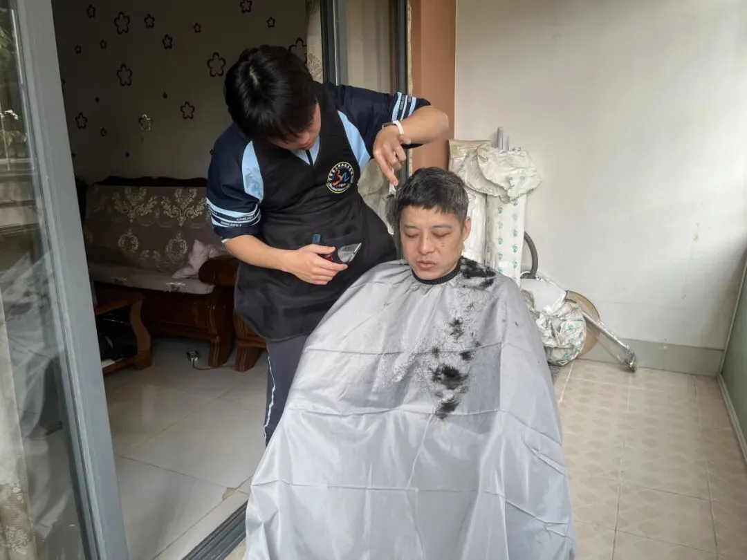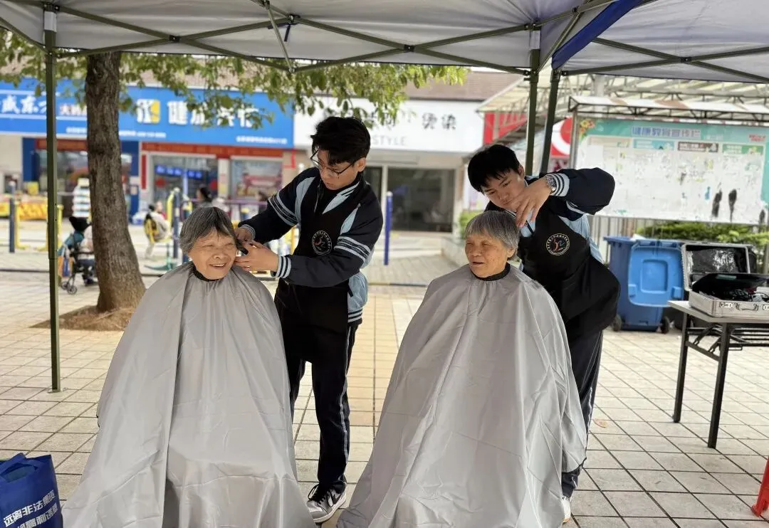 在失明老人的家中,青年教师俯身坐在老人身旁,轻声细语地询问生活起居,唠着家长里短。美发专业陈同学则小心翼翼地为老人修剪头发,每一剪都格外轻柔,生怕惊扰了老人的安宁。老人的嘴角始终挂着微笑,那是对年轻一代无声的赞许。