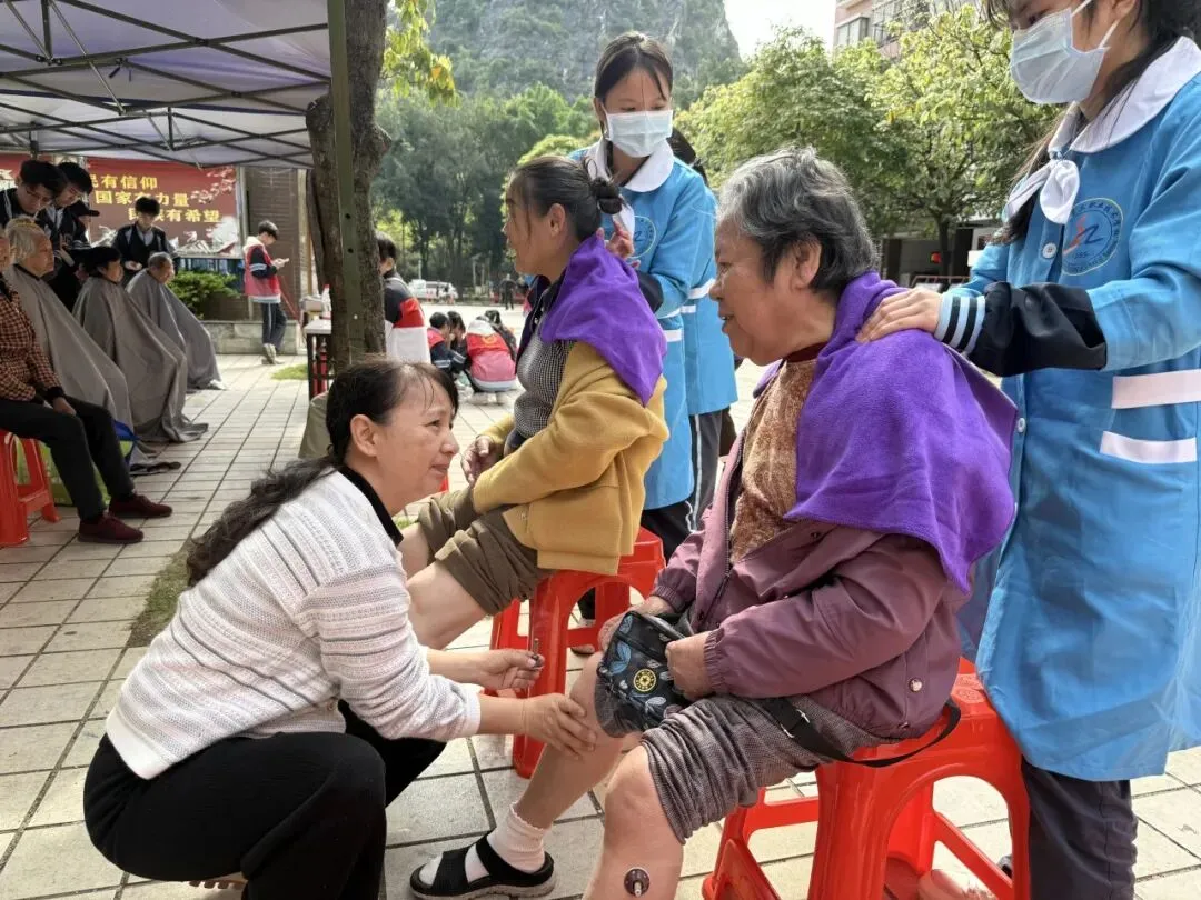 义务剪发的摊位前,美发专业学生细心询问每位老人的需求,剪刀轻快地修剪着耳边的碎发,老人们闭目安享,脸上挂着舒心的笑容。一旁的保健按摩区更是热闹,美容专业的学生一边为老人进行肩颈按摩、头部推拿,一边陪老人唠着家常,笑声不断。带队教师则手持艾条,为老人温和施灸,并耐心讲解穴位保健知识。袅袅艾香中,老人们不仅舒缓了身体的不适,更感受到如家人般的关怀与陪伴。