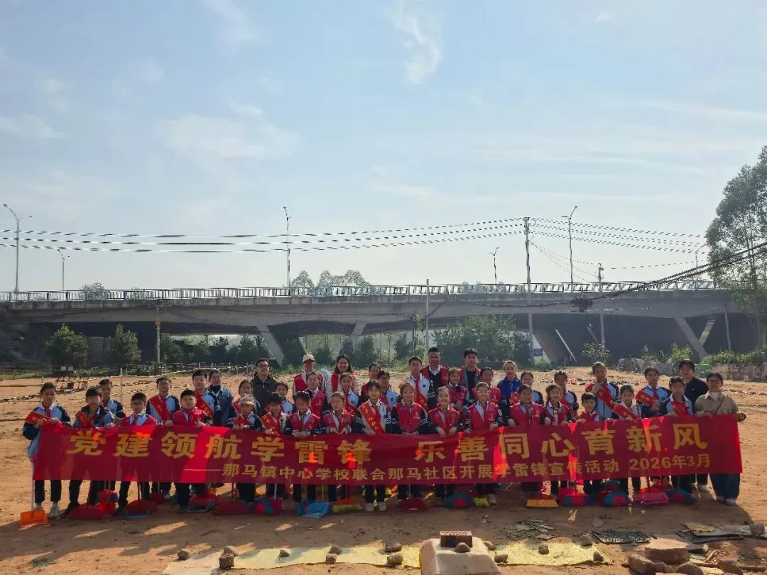 三月春风暖人心,雷锋精神永传承。为深入践行雷锋精神,以党建引领培育校园新风尚,3 月 12 日上午,南宁市良庆区那马镇中心学校联合那马社区,开展学雷锋宣传及志愿服务活动。党员教师主动扛起引领责任,带领 32 名学生志愿者积极参与,将 “奉献、友爱、互助、进步” 的志愿精神融入实践。