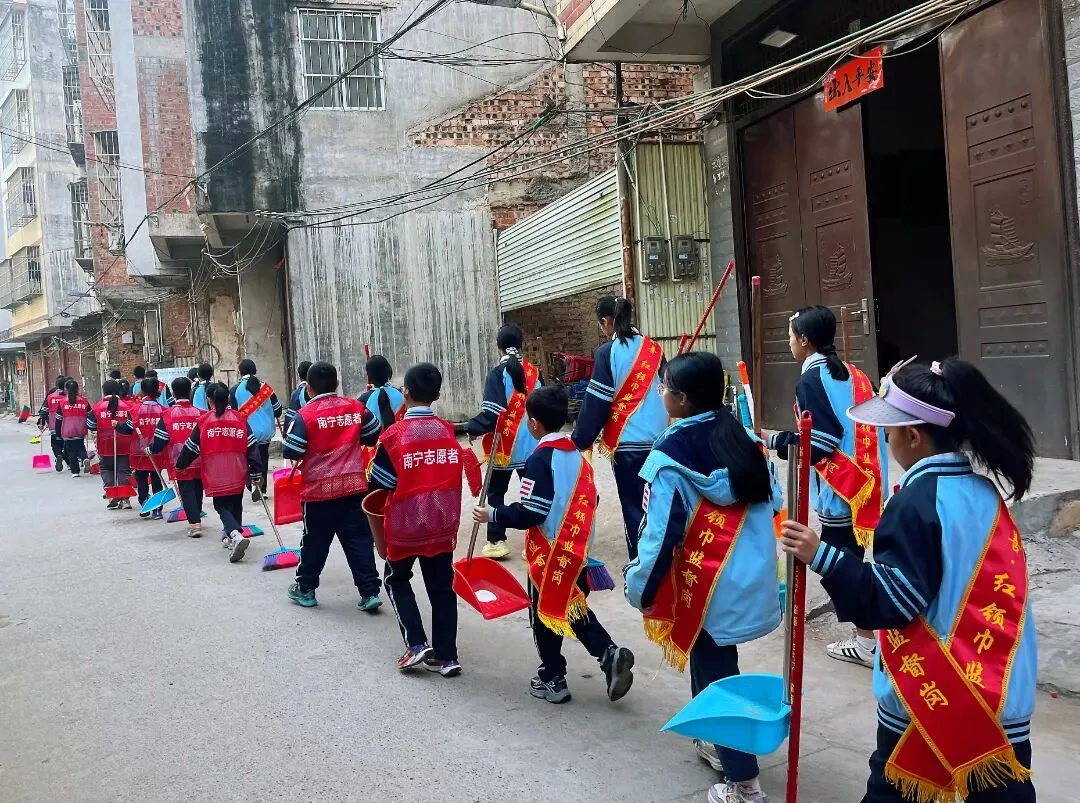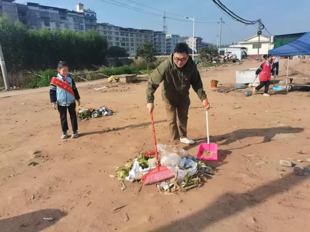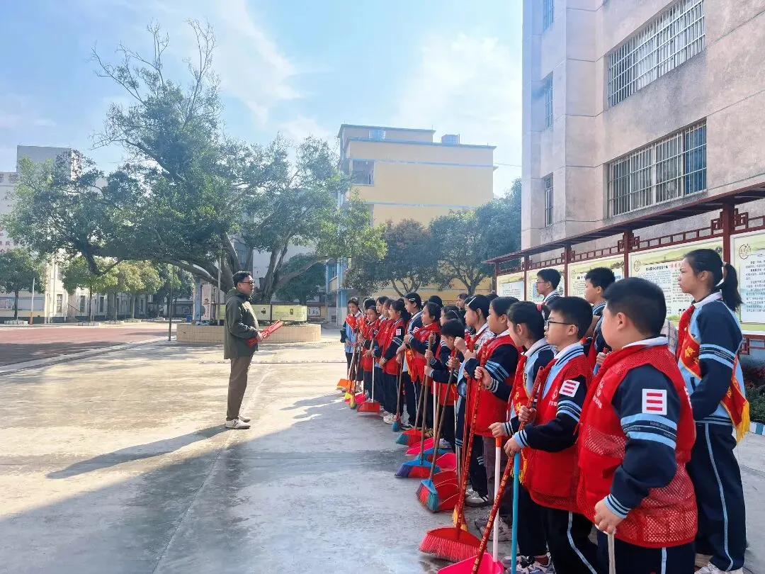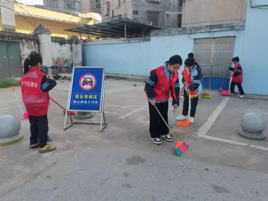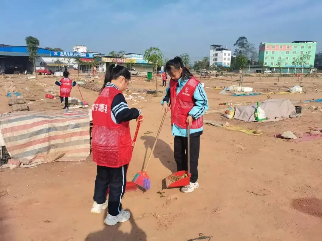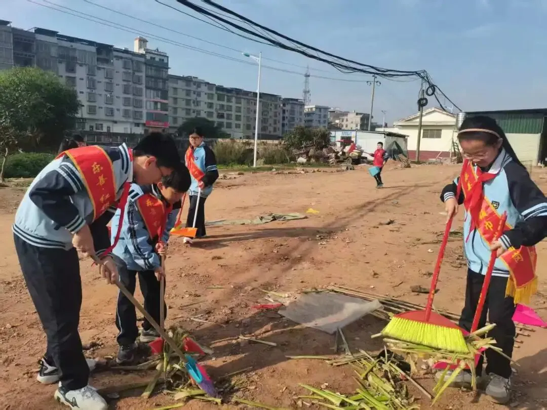 早上8 点,党员教师率先在校门口集合,清点人数、检查工具,细致讲解活动流程与安全注意事项。随后,带领志愿者携带工具,有序前往校门口及沙滩市场区域开展清扫工作。同学们不怕脏、不怕累,红扑扑的小脸上满是认真,用双手美化自己的家园。