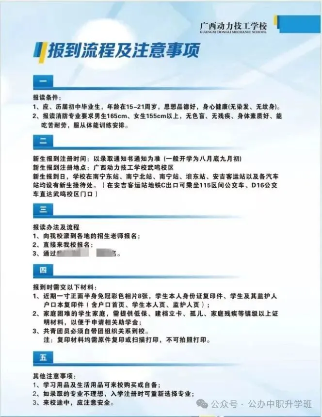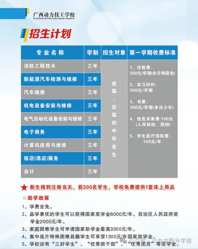 广西动力技工学校招生简章,公办中职免学费,中考出成绩前不看分数,中考出成绩后从高到低录取,择优录取,录满截止,故每年的分数要求不一样,所以家长要提前给孩子预定名额。周老师 19177718919