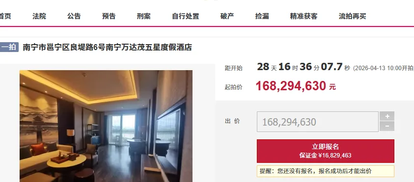 2017年,富力豪掷近190亿、以6折价格接盘万达70余家酒店,当时很多人都以为是富力捡了大便宜了,但谁也没有想到,这几年房地产市场发生巨变,富力集团也是扛不住了,其曾经接手的万达70余家酒店,已经有多家酒店相继被法院拍卖,然后酒店再次出现易主。近日,在阿里拍卖上,富力集团接手的万达70余家酒店又一家被法院拍卖了。此次拍卖的是位于南宁市一家五星级标准的高端酒店,这就是南宁万达茂五星度假酒店(富力接手后已经改名为南宁富力万达嘉华酒店)。此次拍卖的起拍价为1.6829亿元起。