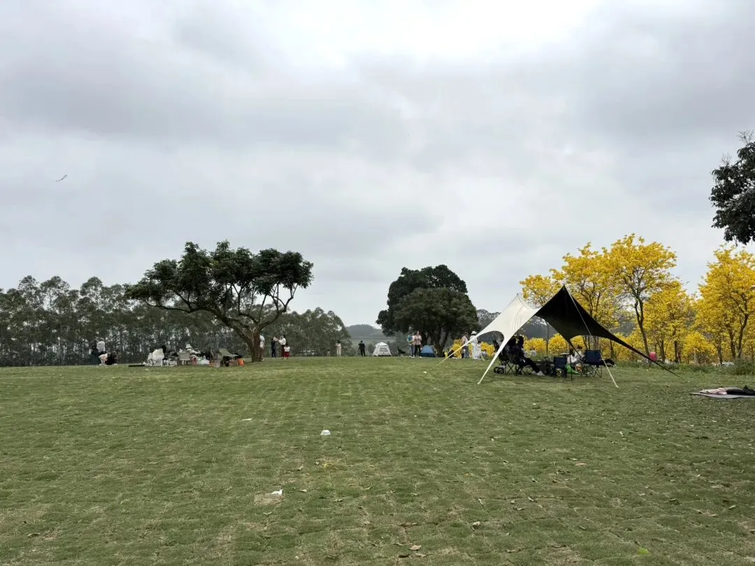 这里是鹿呦山,是一个林下经济创新发展区,免费对外开放。园区种植了大片的桃花、黄花风铃木、紫荆花,还有大片草坪。里面有一个梅花鹿园,养殖了不少梅花鹿,可以在围栏外观赏梅花鹿。红房子矗立在园区门口,远远地就能看见。大王滩也有一个红房子,在山顶上,也算是网红打卡点,在那里可以俯瞰大王滩景区。这里的红房子可以观赏黄花风铃谷,各有各的风景。园区主要分成两个区域,梅花鹿园区和黄花风铃谷,可以开着车在里面随意逛,小车甚至可以开到黄花风铃旁边。但是周末人多最好还是停在外面走进去,否则可能会堵车。青秀山的黄花风铃木可谓刷爆朋友圈,这里的种植面积也挺大,一列列树木整齐划一,黄色灿烂的花朵连成一片,在天空编织了一个金色的梦。不少人精心打扮前来打卡拍照。在黄花风铃谷旁边就是一个大草坪,可以在这里露营、放风筝、欣赏美景。梅花鹿园有围栏围起来,只能在围栏外观赏小鹿。看到人小鹿也会跑过来,很快又跑开了。这里是一个生产梅花鹿系列酒水企业的养殖场,到这里可以免费参观。整个园区不算大,可以在里面散步、拍照、露营,里面有一些车尾箱咖啡,没有其他餐饮。这里离大王滩风景区不远,可以游览完去大王滩继续游玩,那里面有一些餐馆,可以吃吃河鱼。大王滩风景区现在半价优惠,到2026年4月30日。